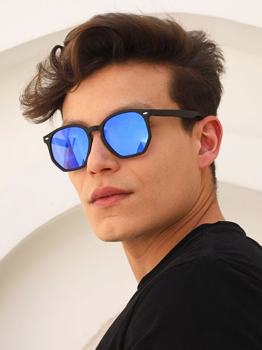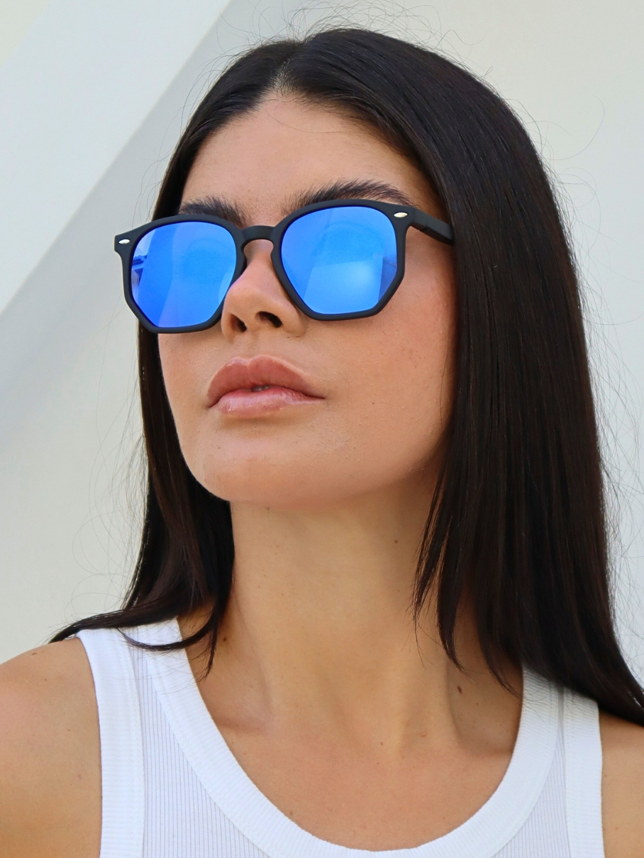 Óculos de Sol Tulum Azul Espelhado Armação Preto Degradê Hexagonal Premium uv400 Feminino Masculino