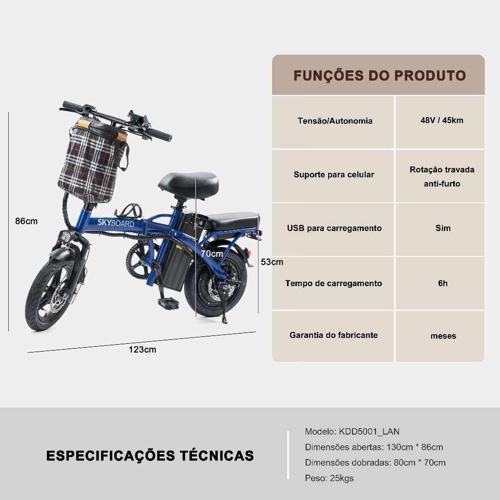 👍🔥Upgrade de Garantia SKYBOARD Bicicleta Elétrica Dobrável Bivolt 48V15Ah autonomia 45km farol LED suporte de celular
