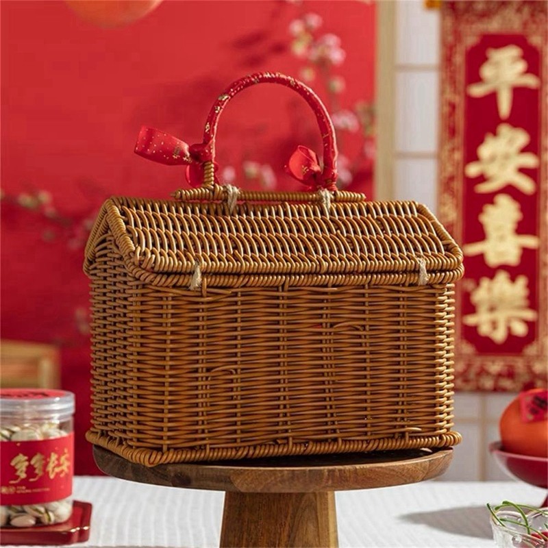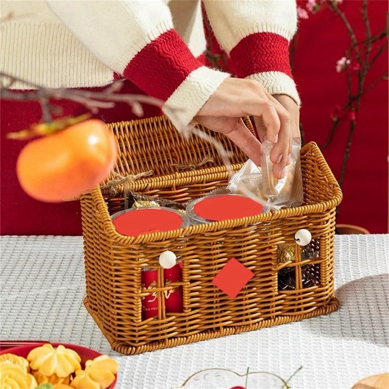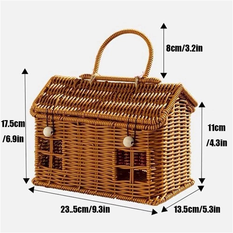 🔥Cesta de Imitação Rattan em Formato de Casa com Tampa, Organizador de Prateleira Decorativo Feito À Mão com Alça Dobráv