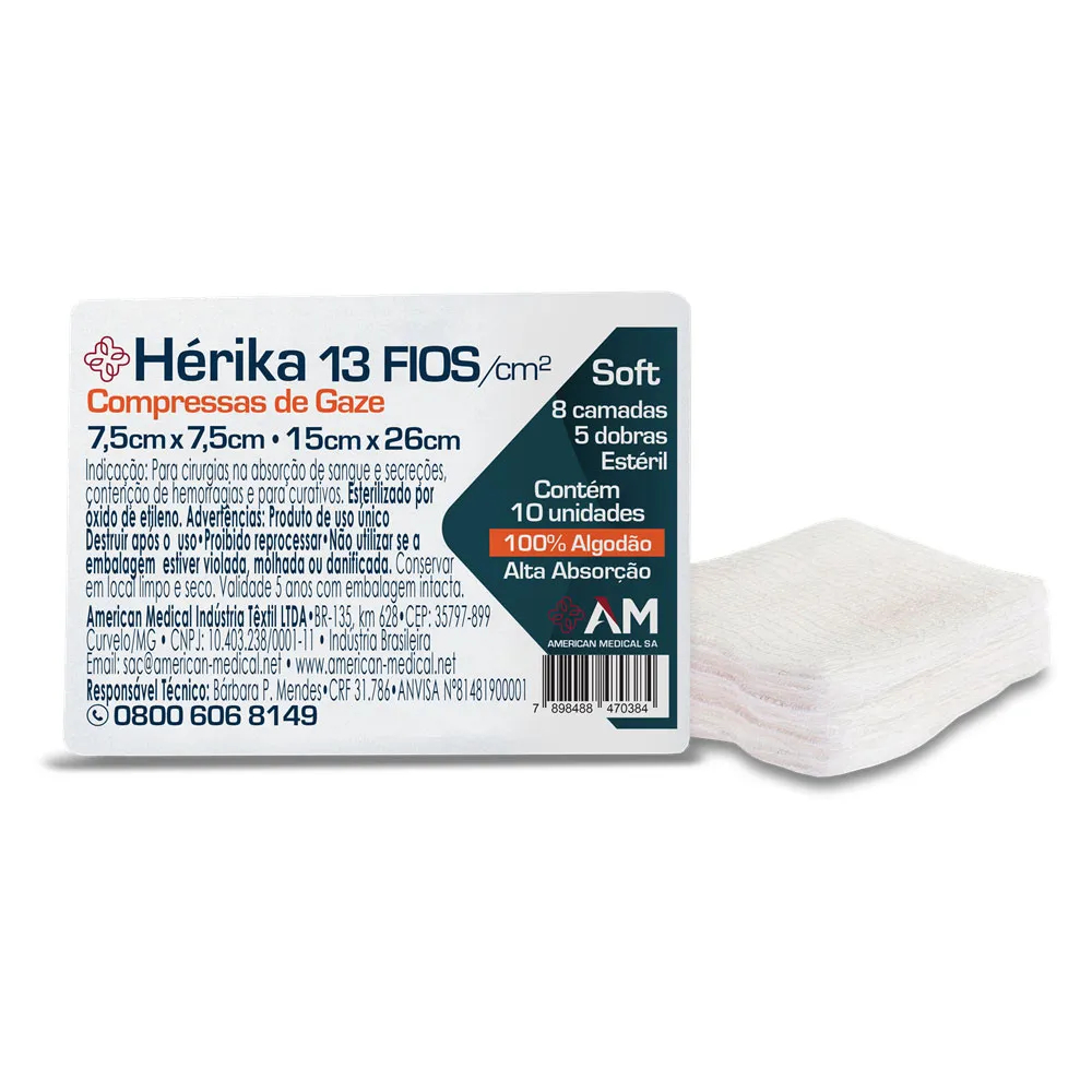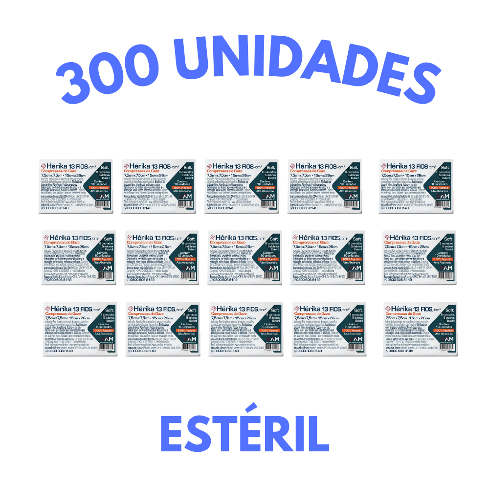 300 Compressa de Gaze Estéril Hérika Hidrófila 13 Fios - 7,5x7,5cm - 15x26cm (30 pacotes Hérika)