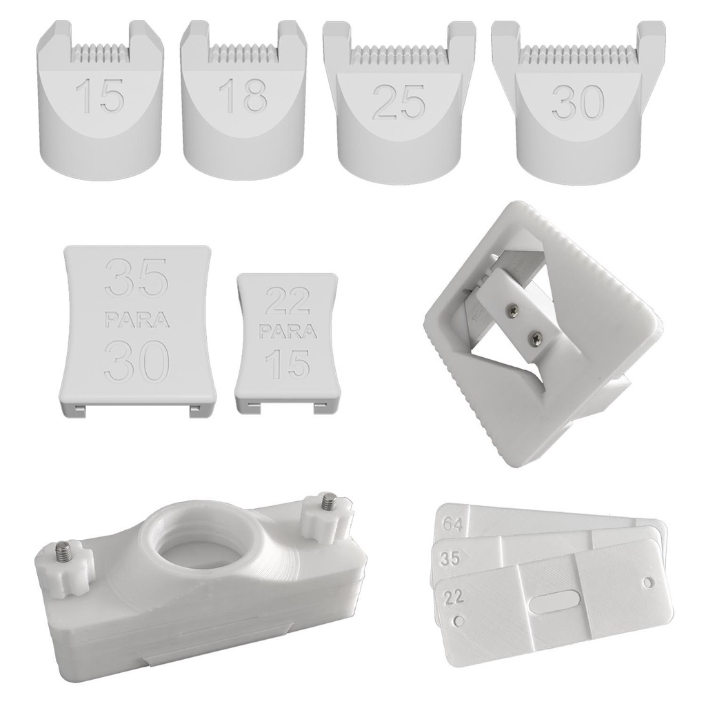 4 Cola Topo MDF + 1 Cola Fita Borda para 3 tipos de fitas + 1 Refilador + 2 Guias Centralizadores