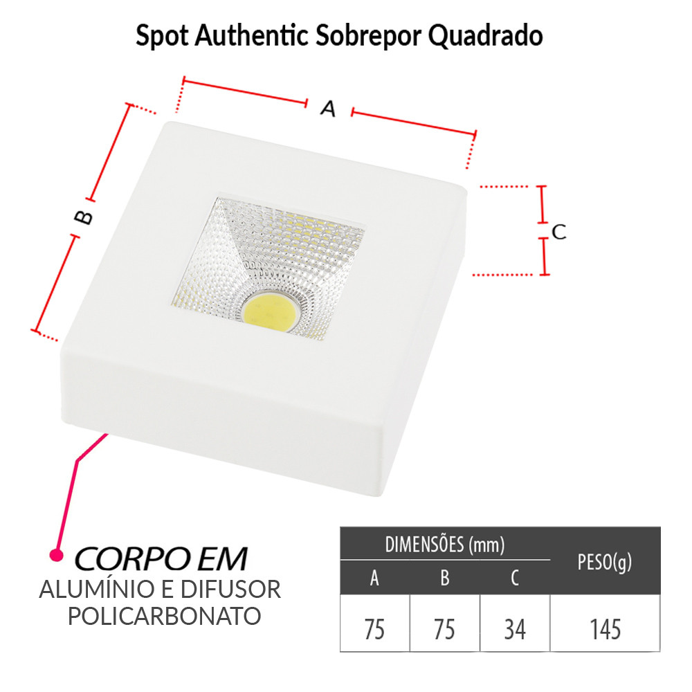 5 Spot Authentic Plafon Sobrepor Teto Beiral Quadrado Luz Neutra 4000K 5w Avant