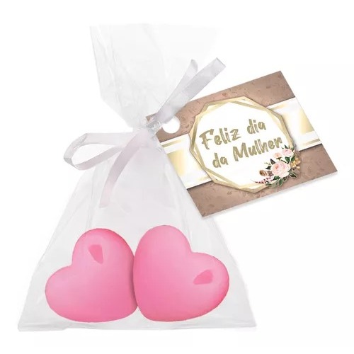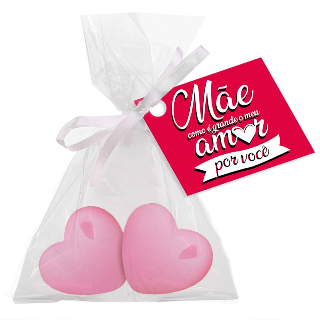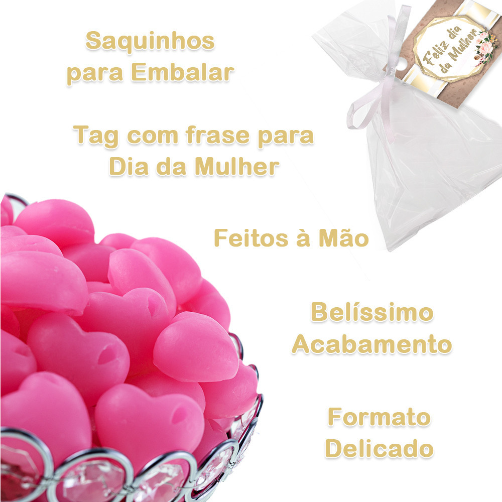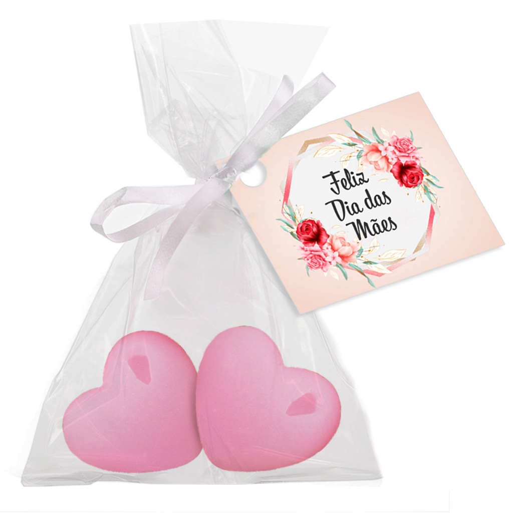 50 Lembrancinhas Dia das Mães Dia da Mulher Sabonetinho de Coração Rosa Mimo Cliente TAG e Saquinho