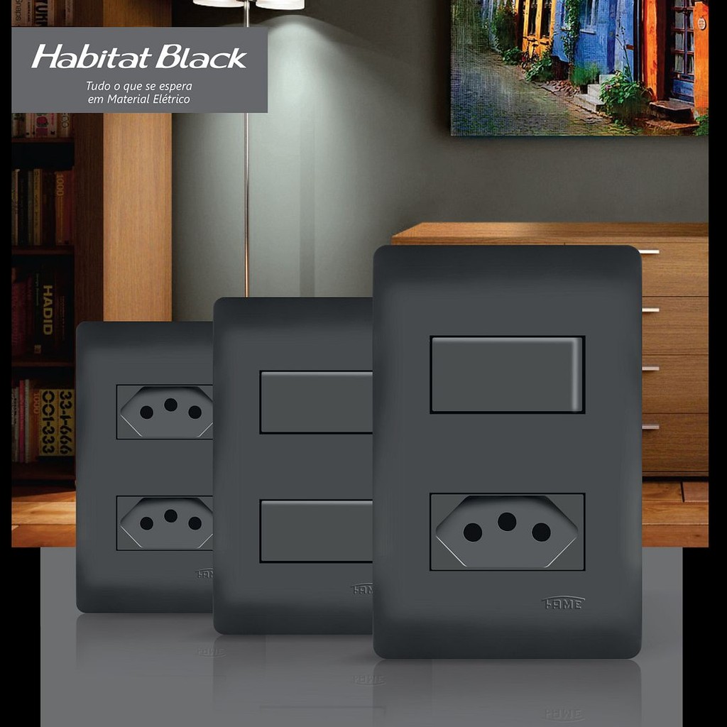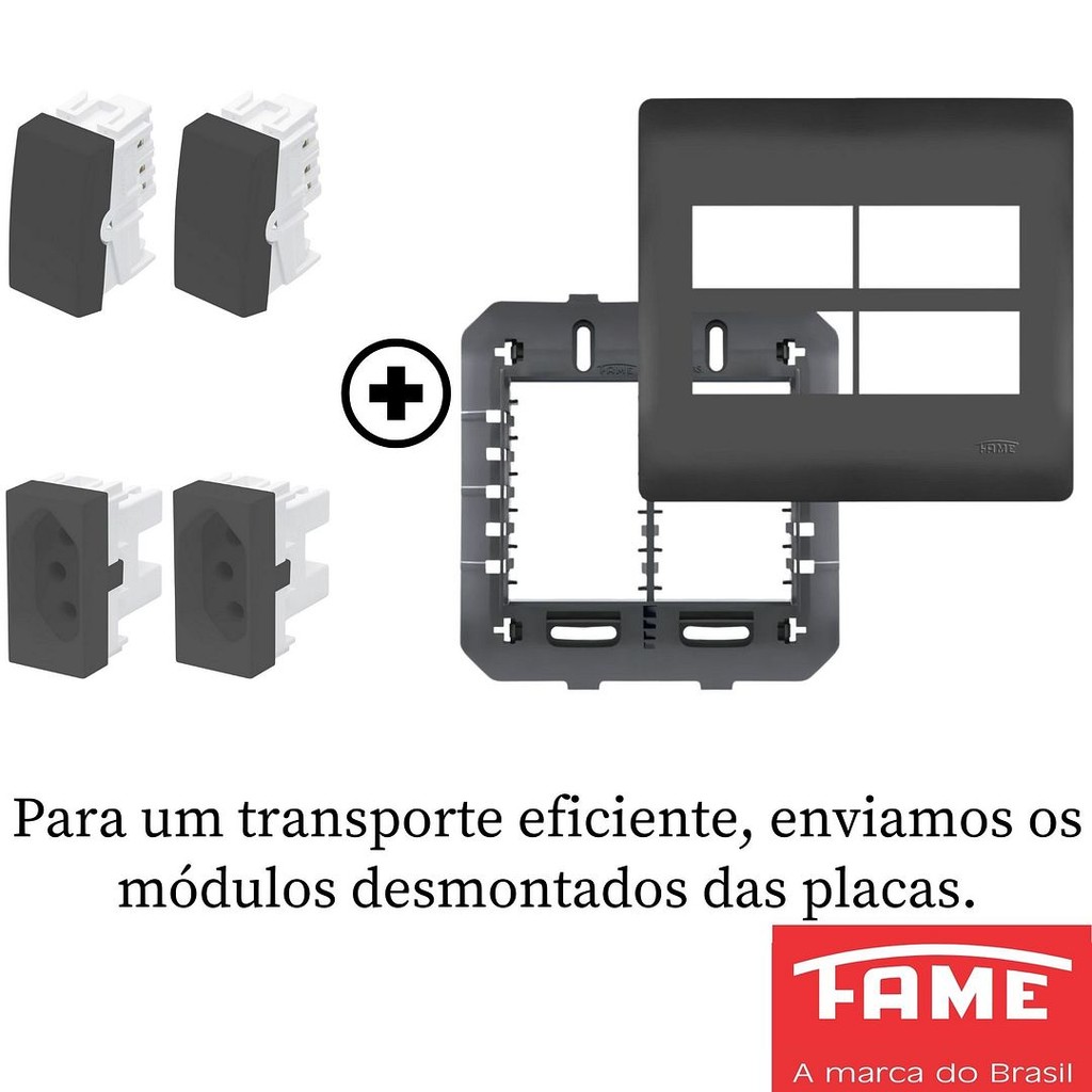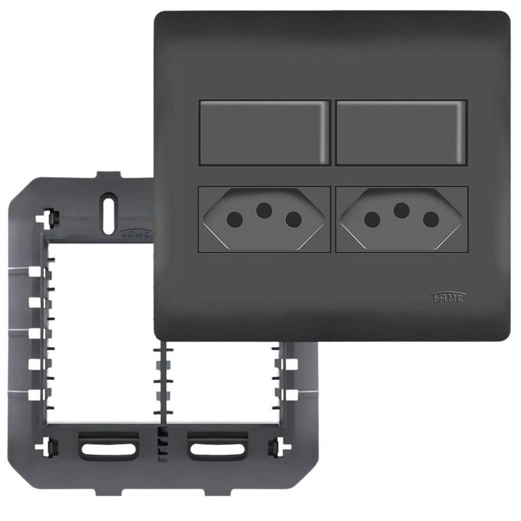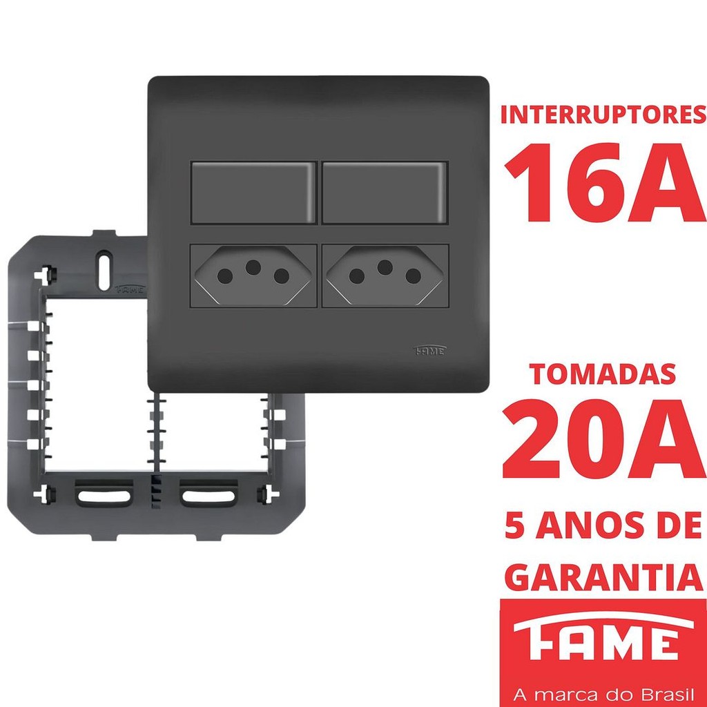5un Interruptor Simples 10A 2 Teclas e Tomada Padrão Dupla 2P+T 20A Com Placa 4X4 Habitat Black FAME
