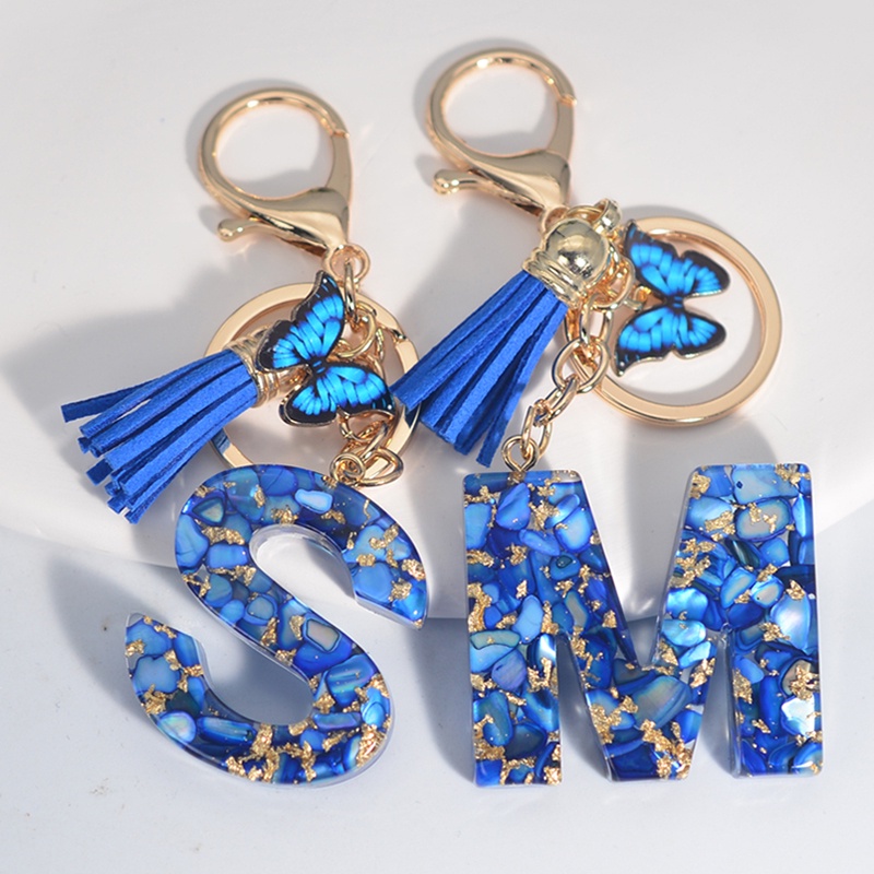 A-Z Resina Recheada Com Lantejoulas De 26Letter Keychain Fashion Blue Tassel Butterfly Pendant Anel Chaveiro Para Mulher Homem Mala De Mão De Carro Acessórios