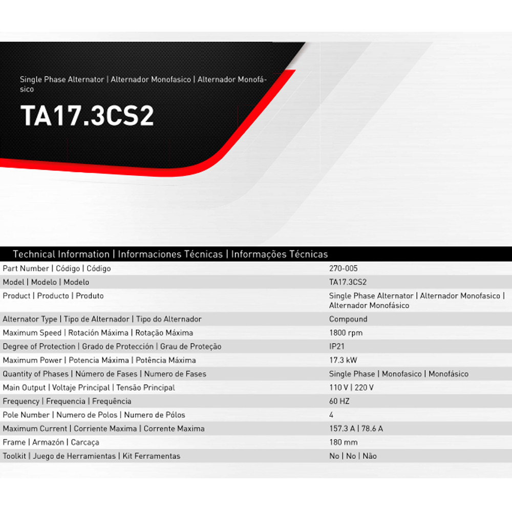 Alternador Monofásico Bivolt da Toyama TA17.3CS2 com Potência de 17.3Kw Recomendado Motor 1.800RPM