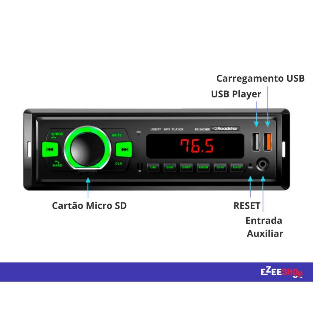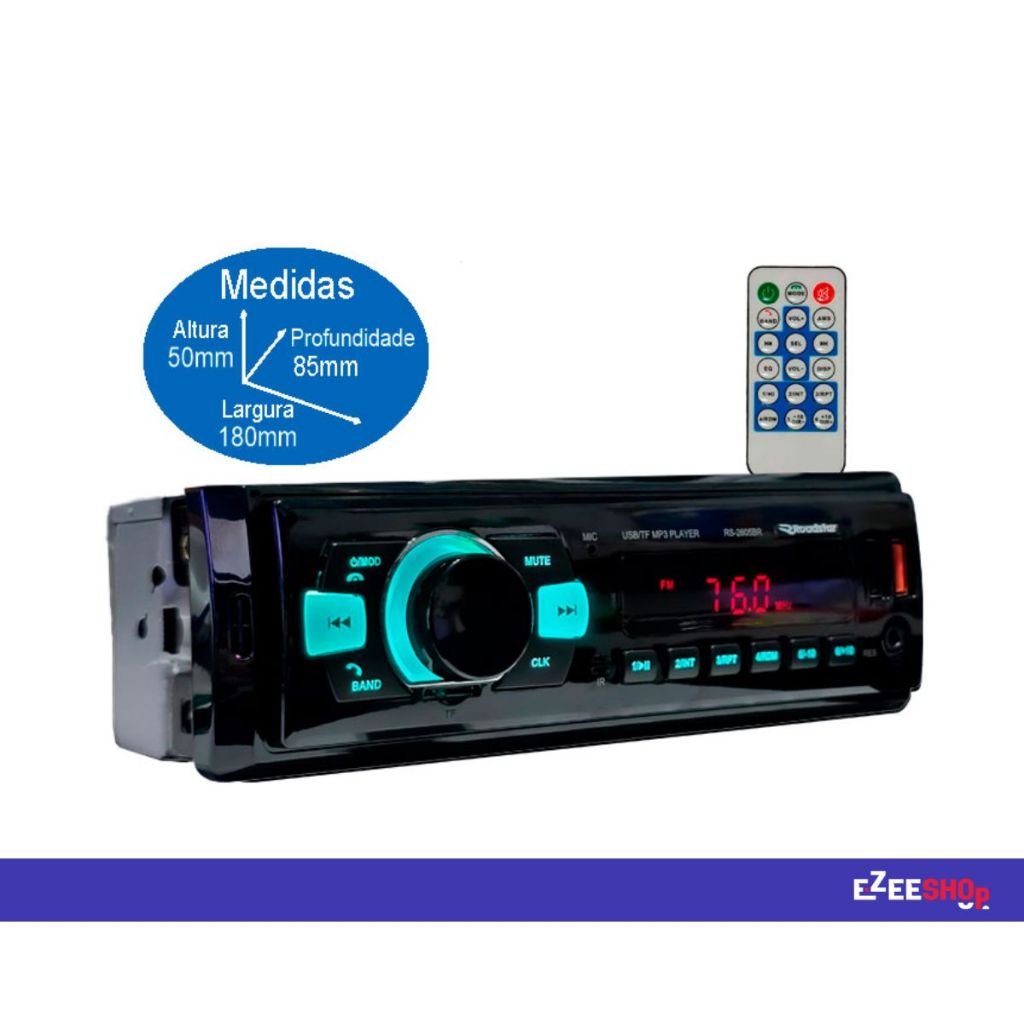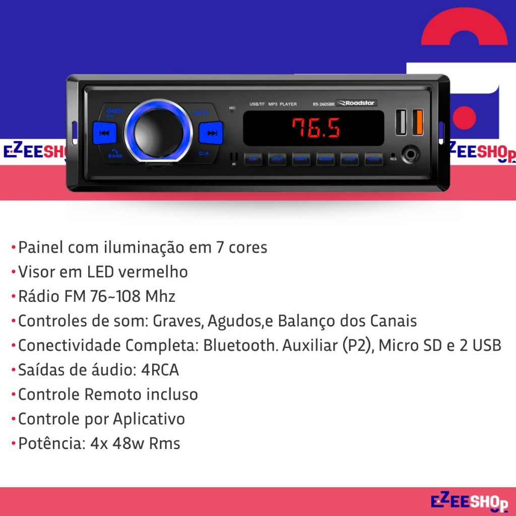 Aparelho de Som Automotivo Bluetooth USB Rádio FM c/ Controle RS2605BR Roadstar