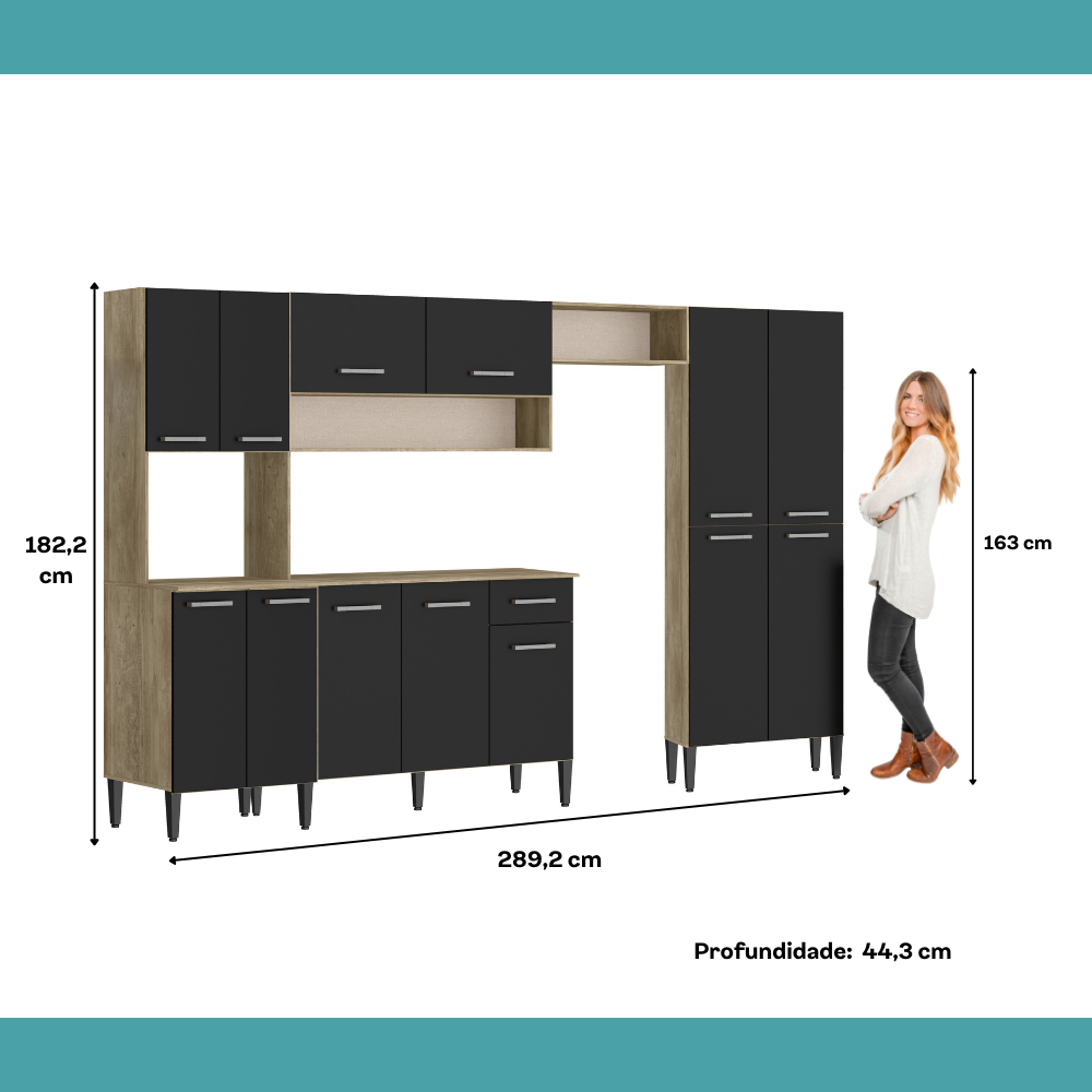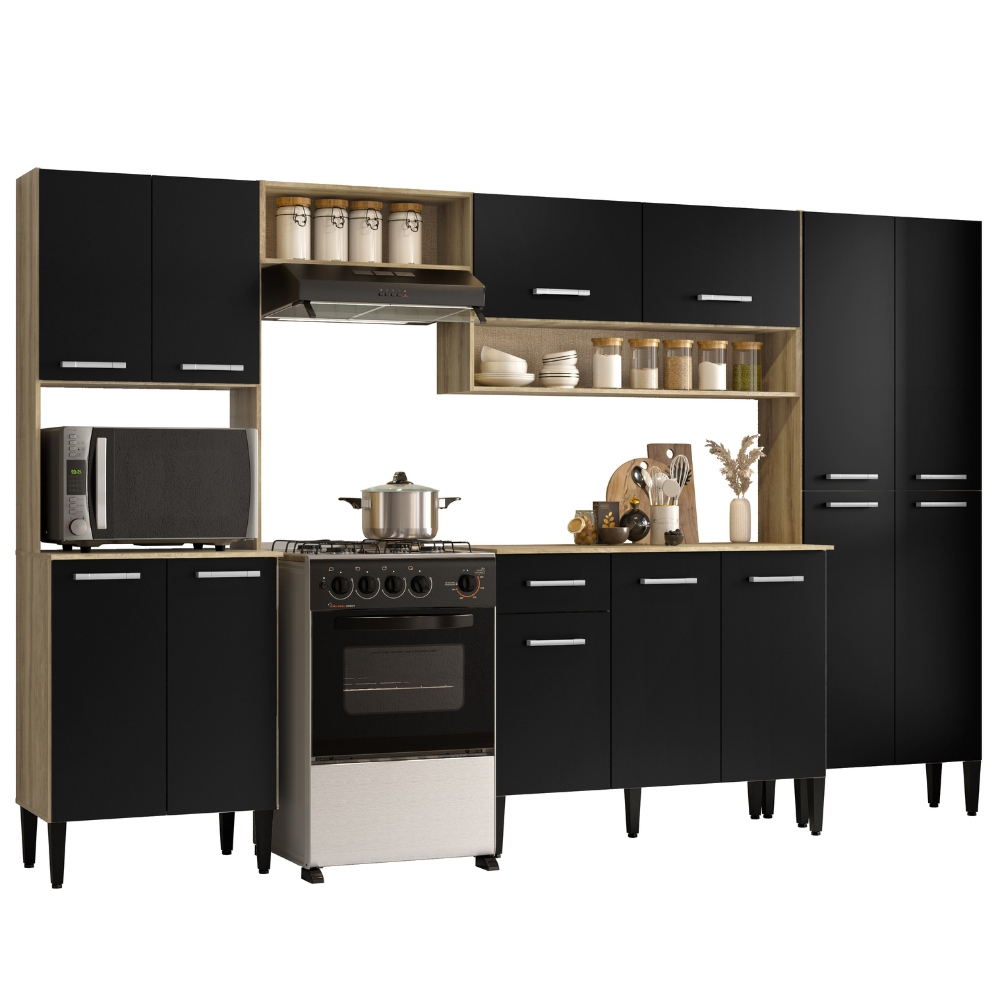 Armário Cozinha Completa Arizona Plus Carvalho com Preto Carraro