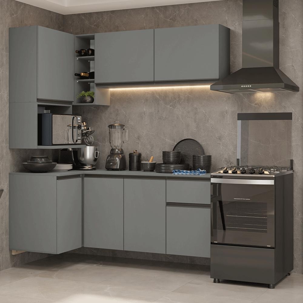 Armário de Cozinha Completa de Canto 265 cm Suspensa Cinza Nice Madesa 06