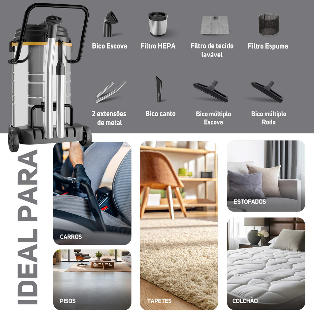 Aspirador de Pó e Água Profissional 2800W GTW INOX 70i Função Autolimpante Wap Bocal de Sopro
