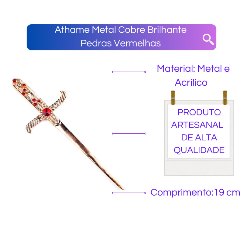 Athame Metal Cobre Brilhante 19 cm Pedras Vermelhas