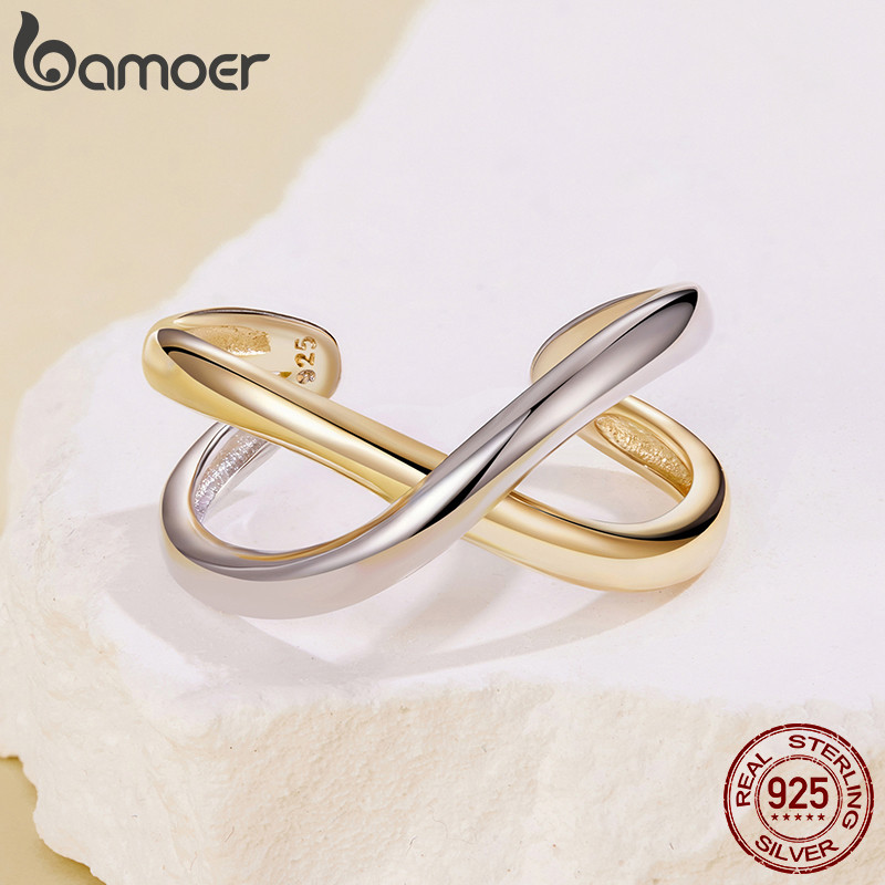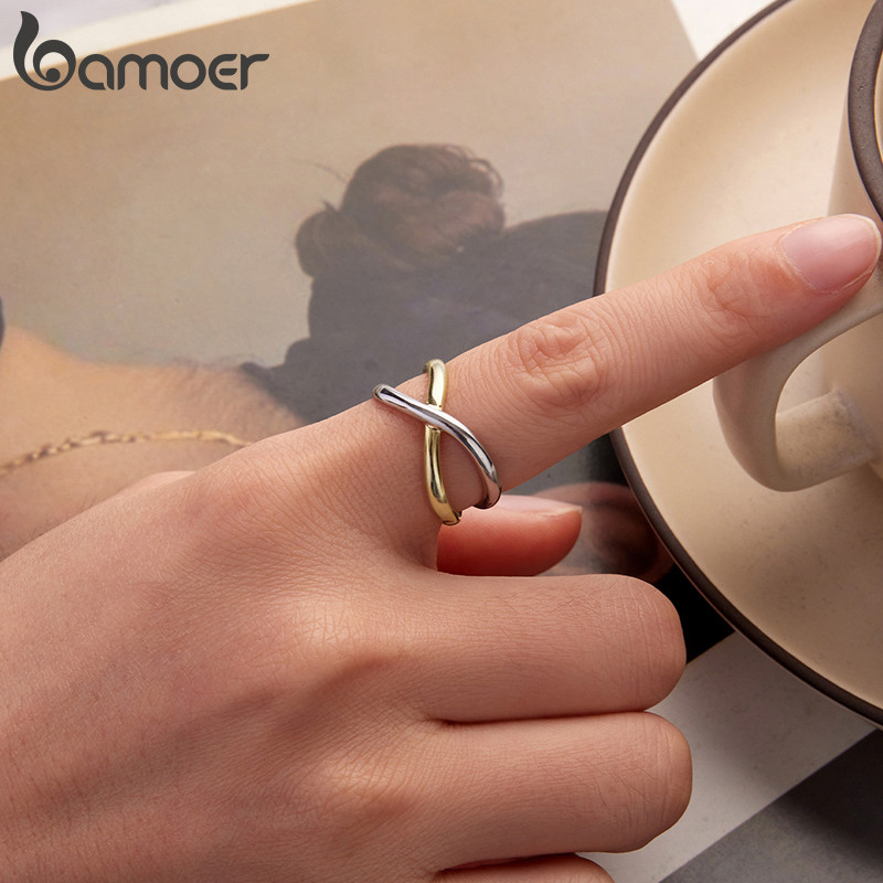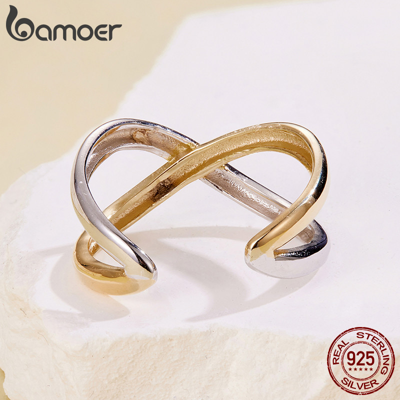 BAMOER Design Original 925 Prata Esterlina Anel Aberto Tamanho Ajustável Dois Tons Cruz Moda Jóias Presentes Para Mulher