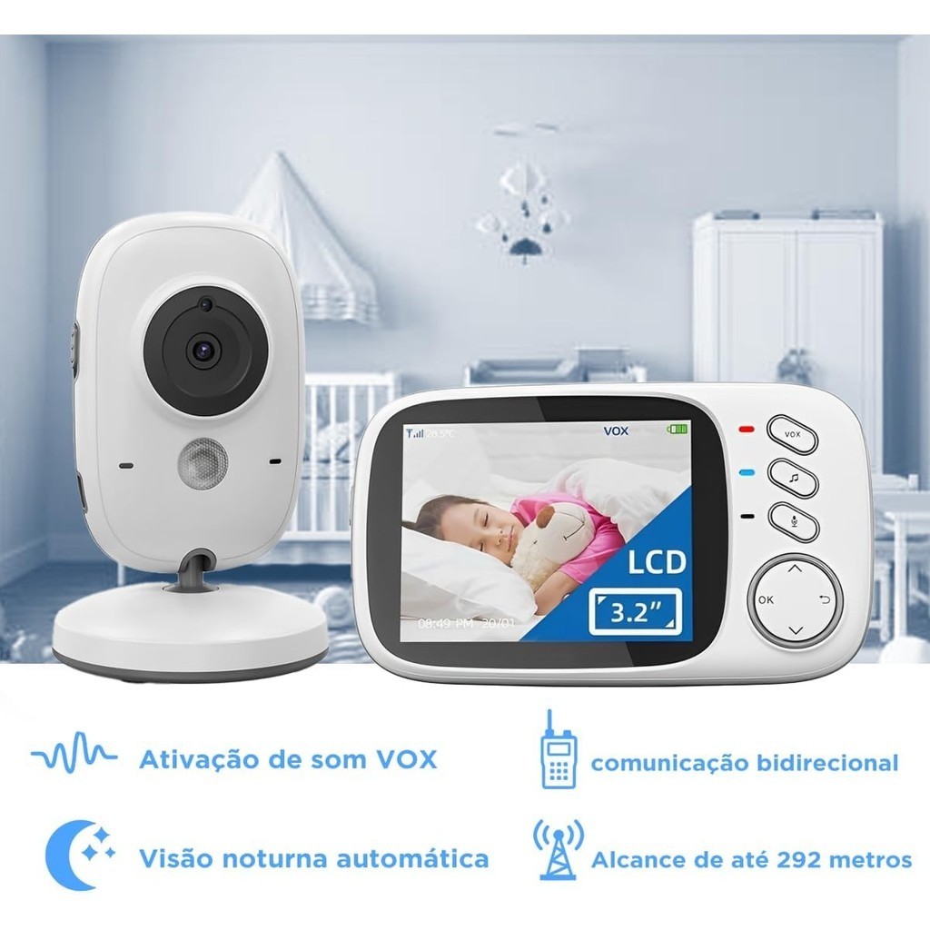 Baba Eletrônica Com Monitor Visão Noturna, Câmera c/ Audio Sensor de Temperatura