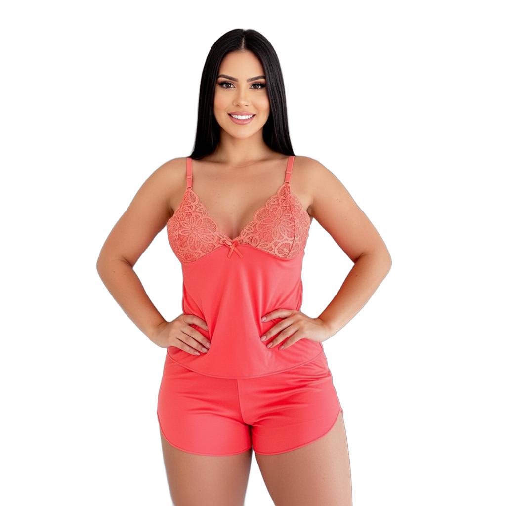 Baby Doll Pijama sem Bojo com Renda Short Doll Helânca
