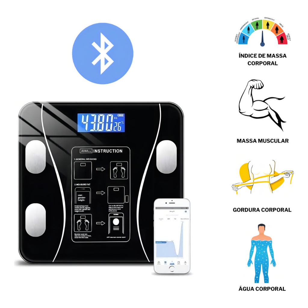 Balança Corporal Bioimpedância Vidro Profissional Bluetooth
