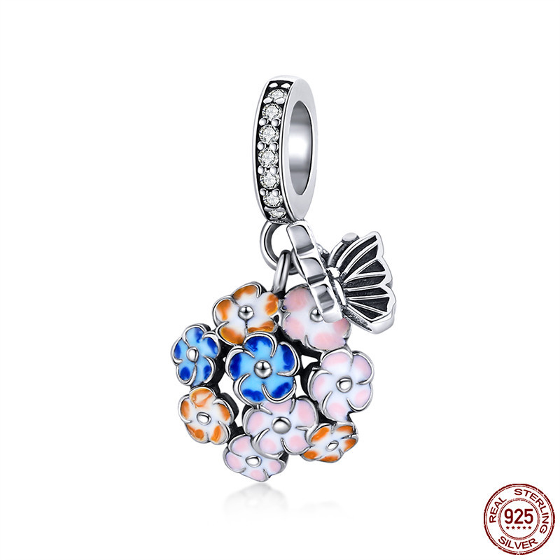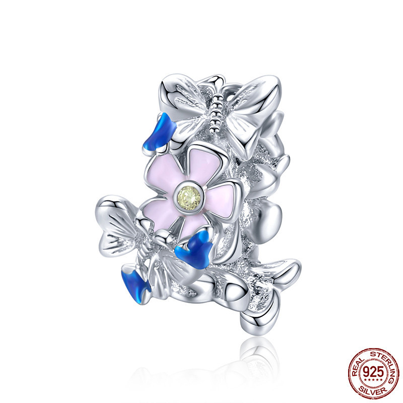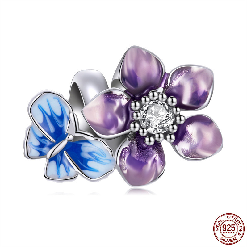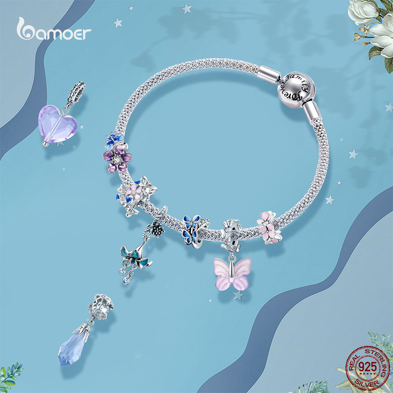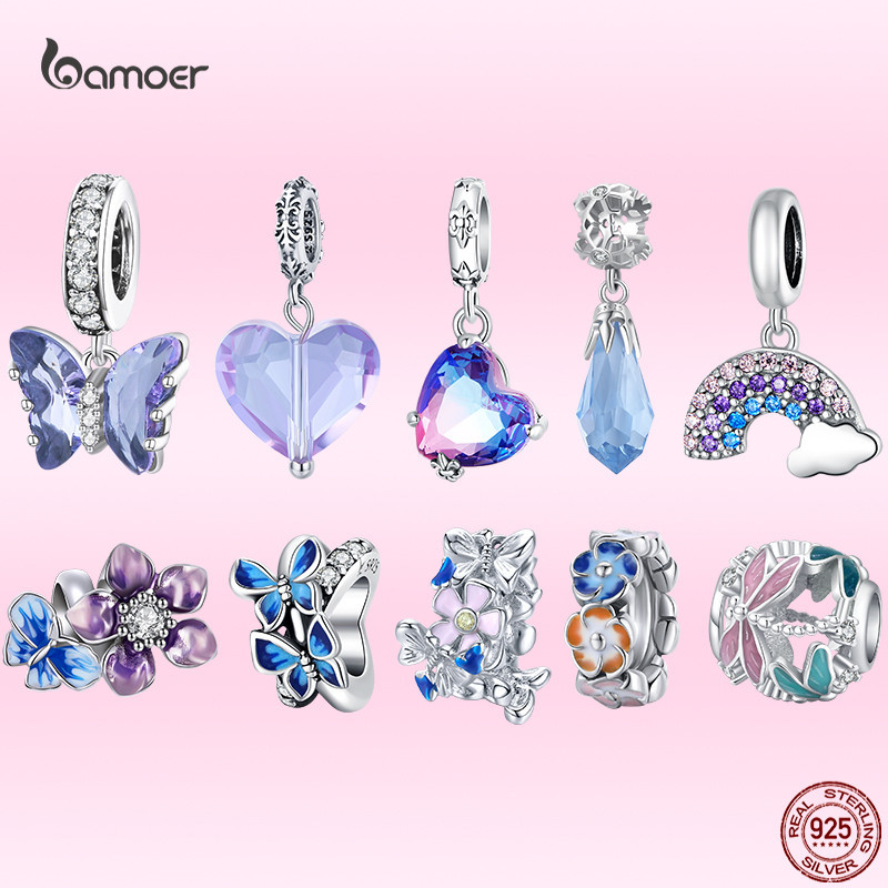 Bamoer 925 Sterling Silver Butterfly Charms Beads Purple Flower Pingente Arco-Íris Pulseiras Originais De Bricolage Bangle Jewelry Gifts