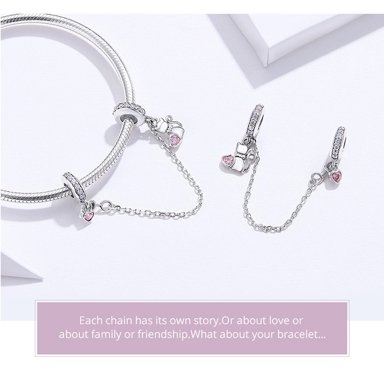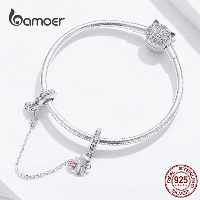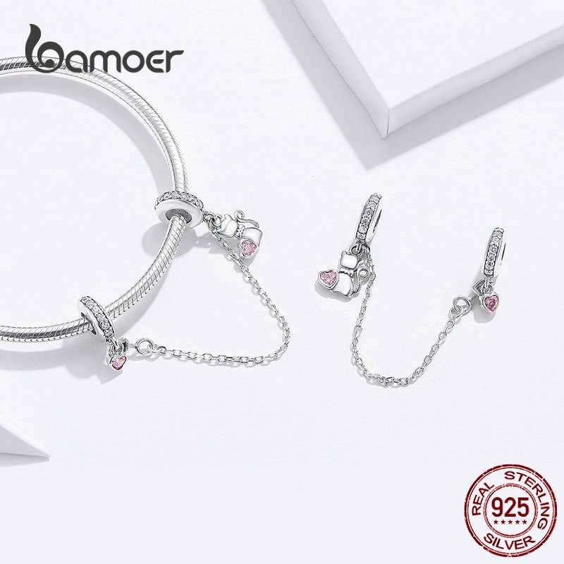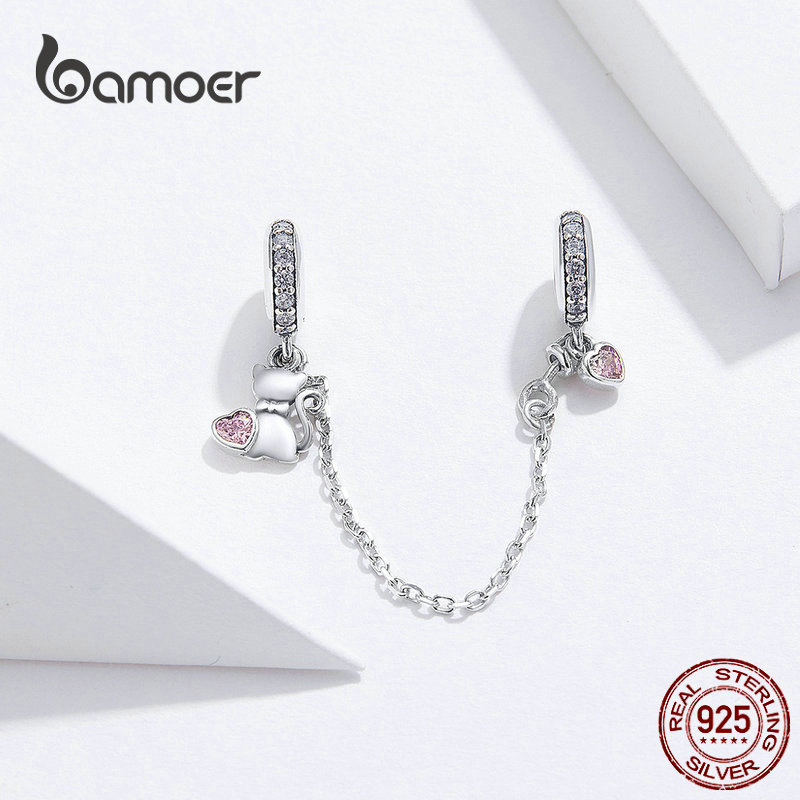 Bamoer Pet Cat Coração Corrente De Segurança Com Silicone 925 Sterling Silver Charm Para Bracelet & Bangle Jóias DIY SCC1233