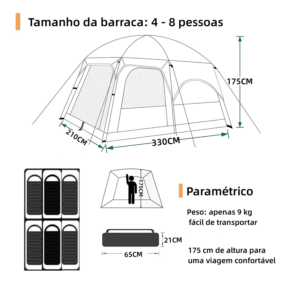 Barraca De Camping Acampamento 4-8 Pessoas 330*210*180cm Impermeavel 2000mm Grande Varanda