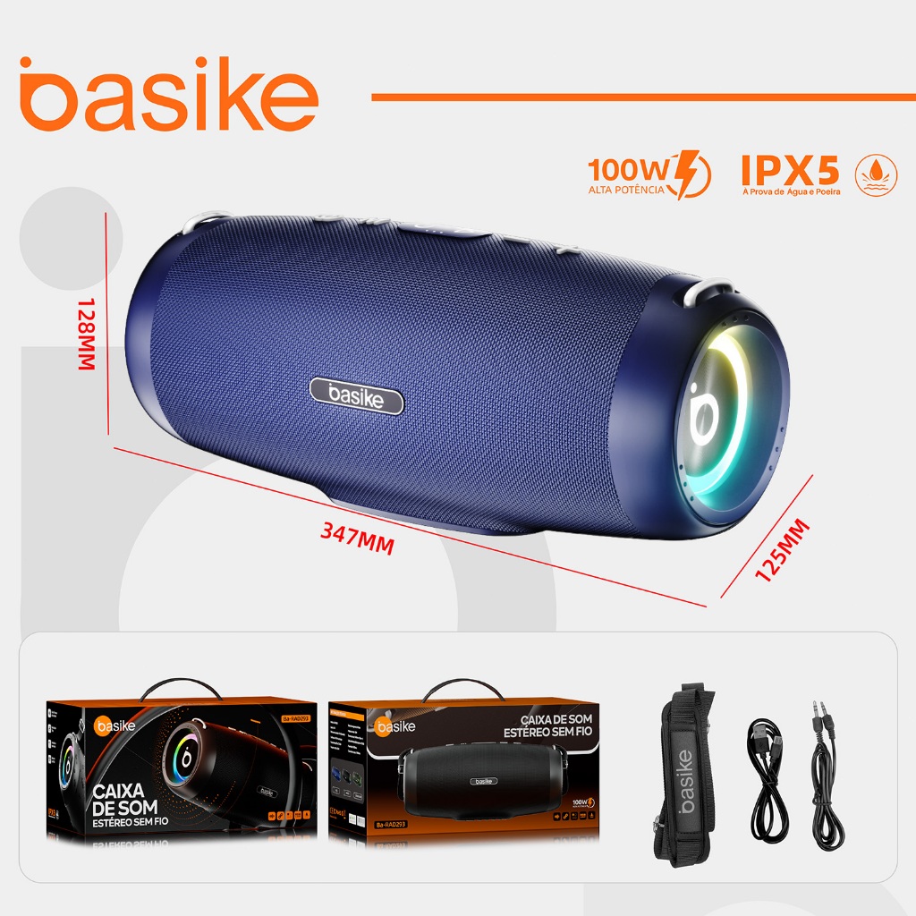 Basike Caixa de Som Bluetooth 100W Portátil Super Bass BOOST Festa PraiaTWS RGB Som Potente À Prova D'Água Alça de Ombro