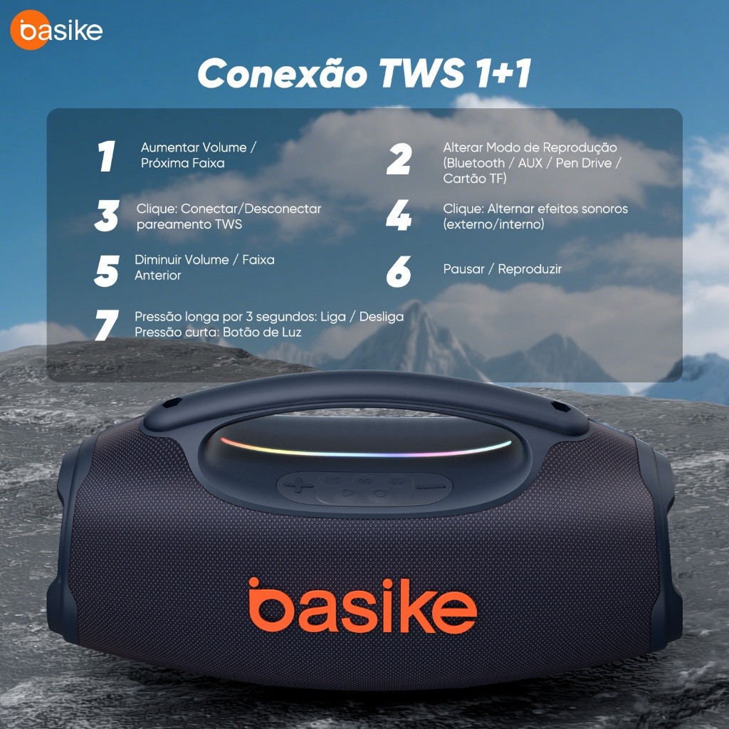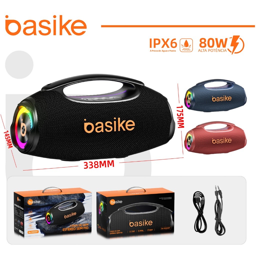Basike Caixa de Som Bluetooth Estéreo 80W Potente IPX6 TWS RGB