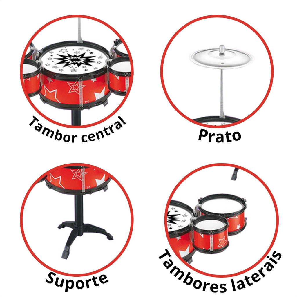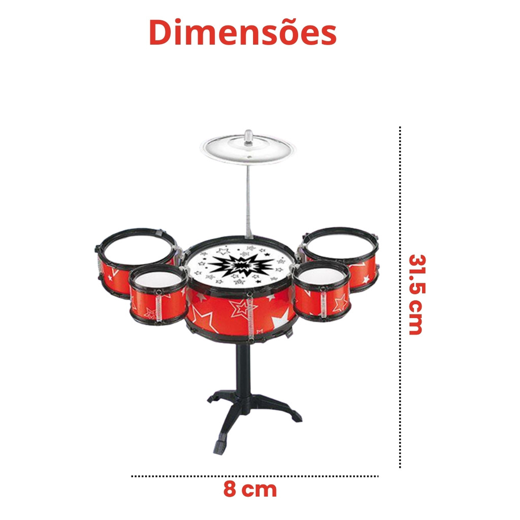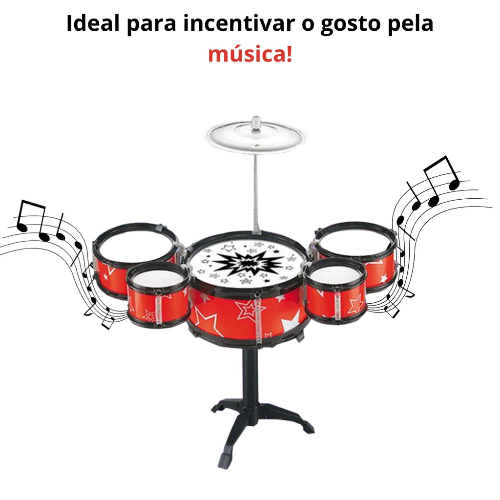 Bateria Infantil Instrumento Musical 5 Tambores Azul e Vermelho Brinquedo Infantil