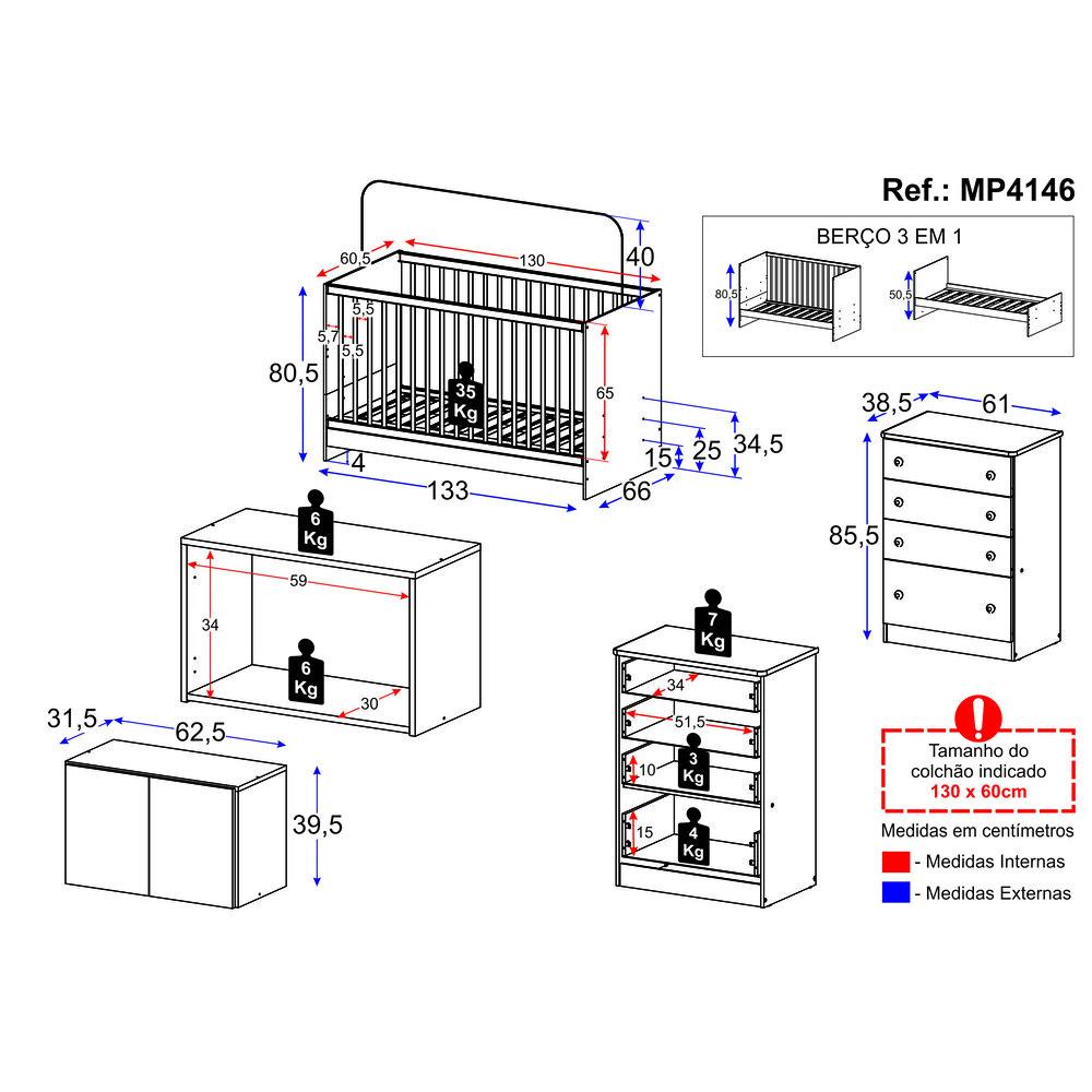 Berço 3 em 1 com Armário Aéreo e Cômoda Multimóveis MP4146