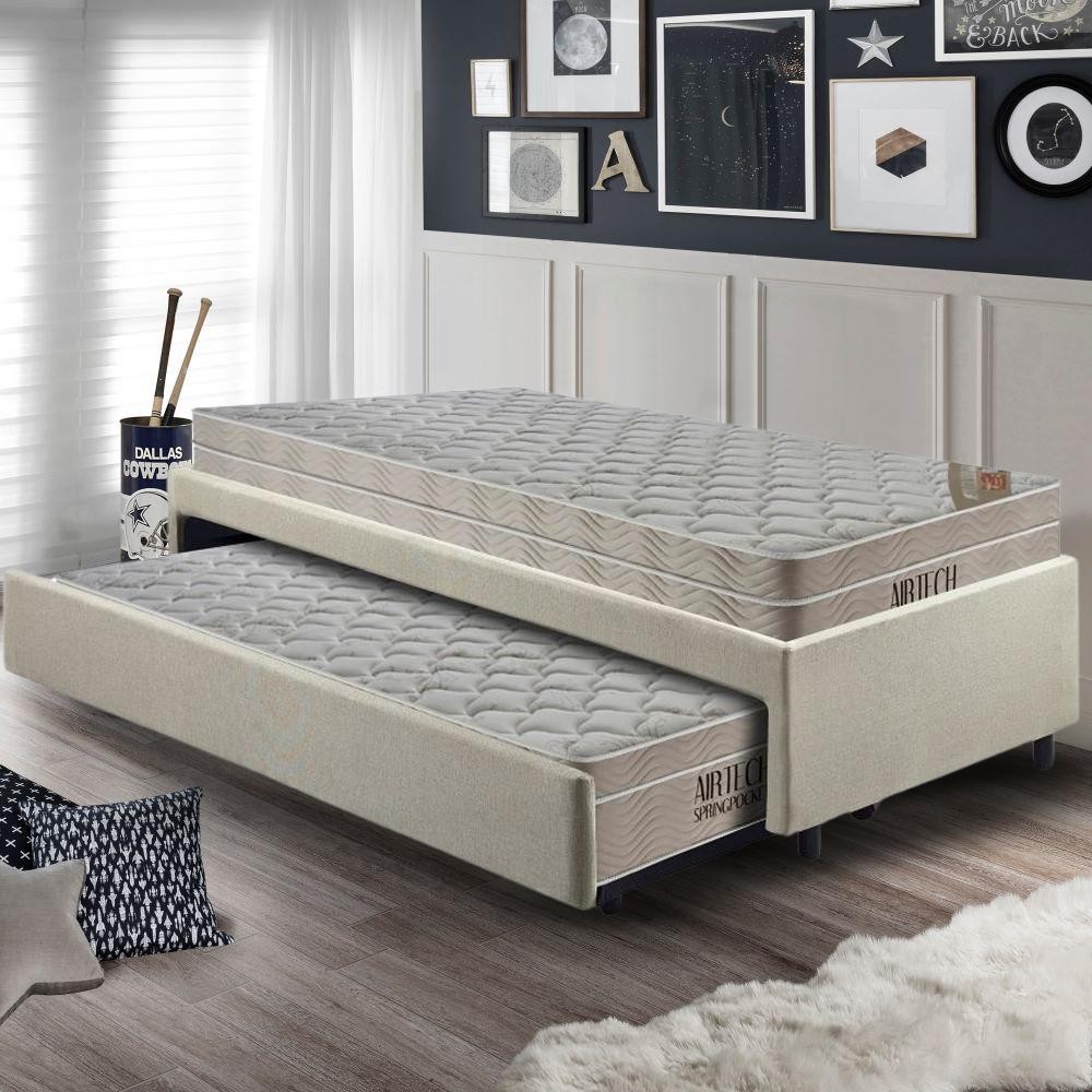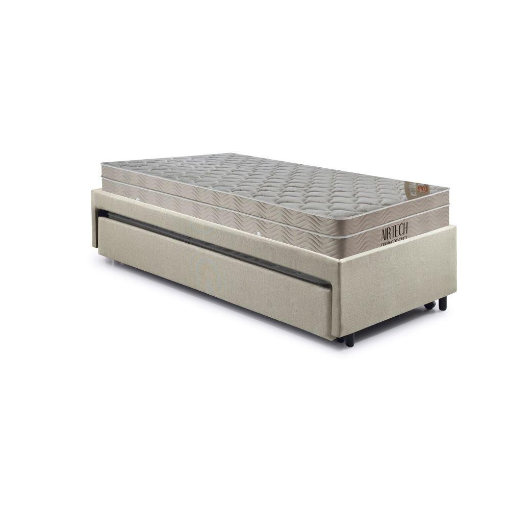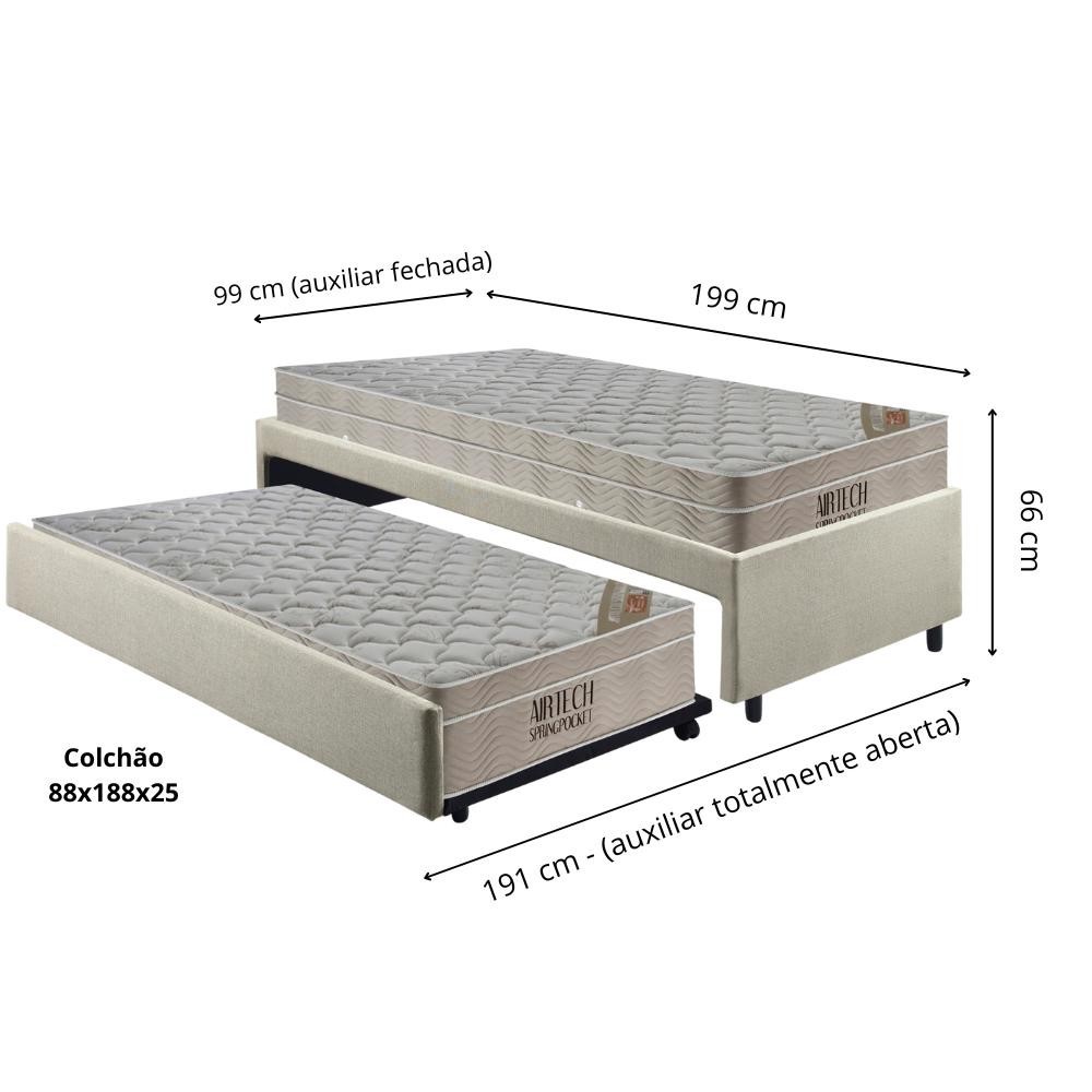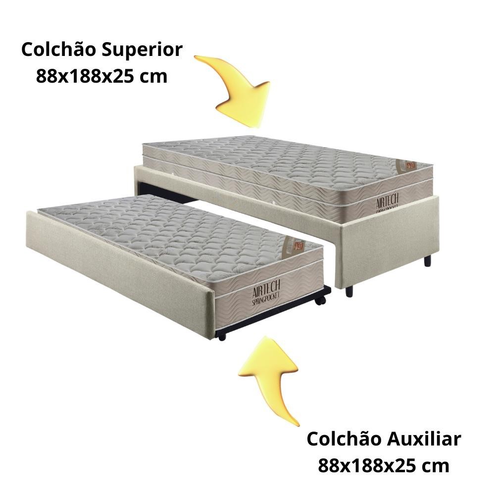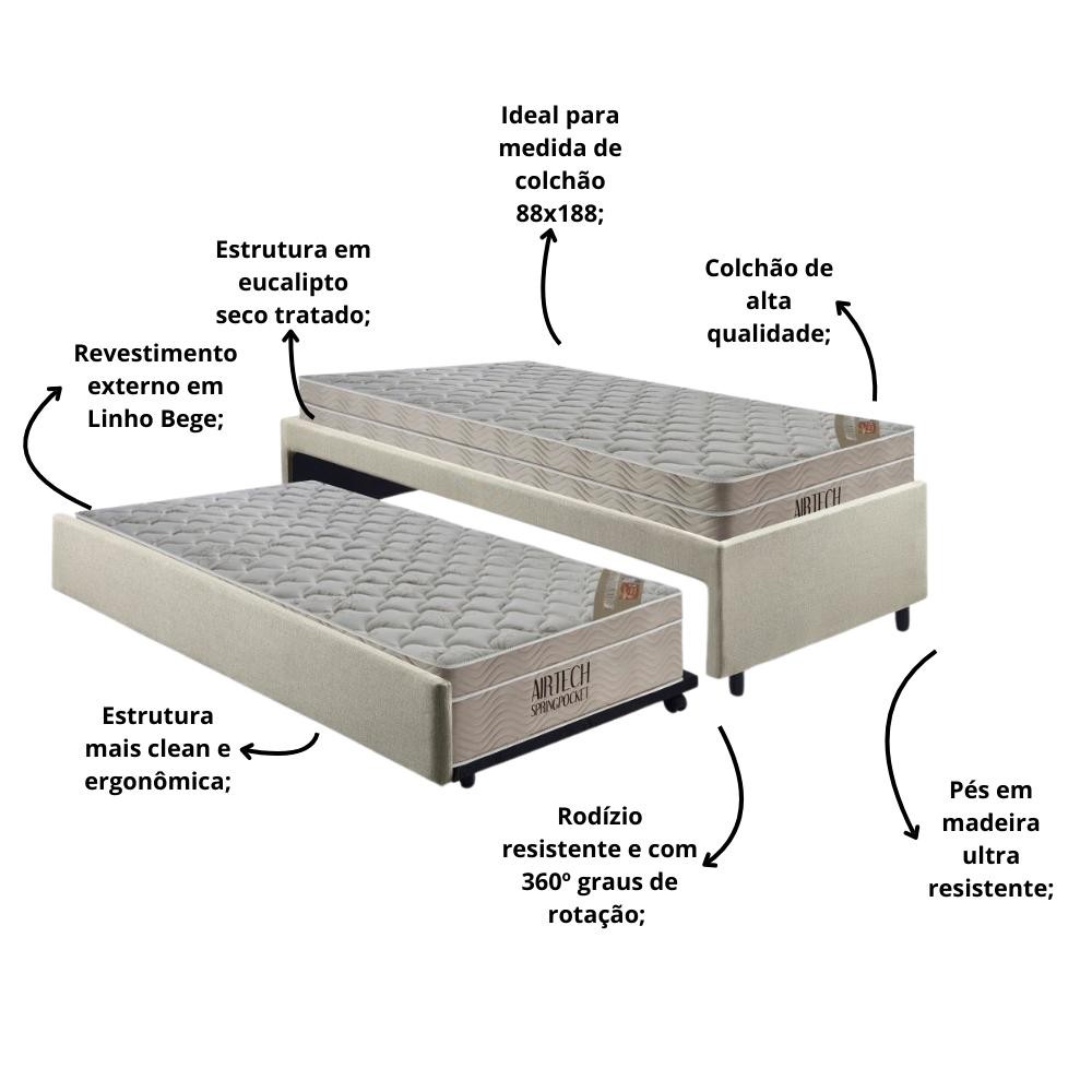 Bicama Box Solteiro Linho Bege 88x188 Com Dois Colchões Airtech Molas Ensacadas Ortobom