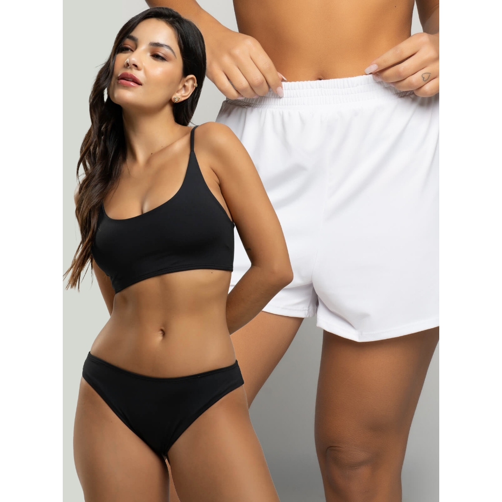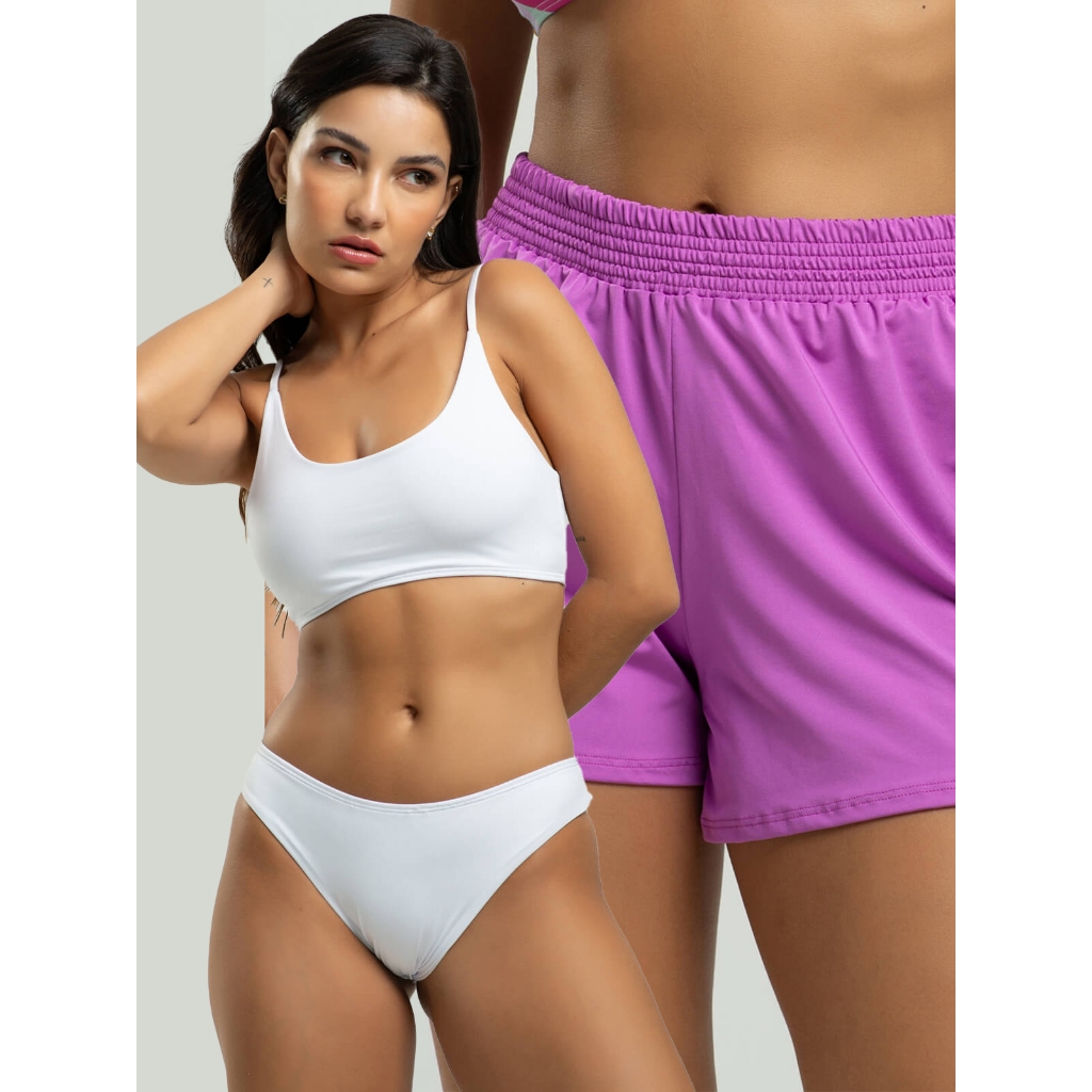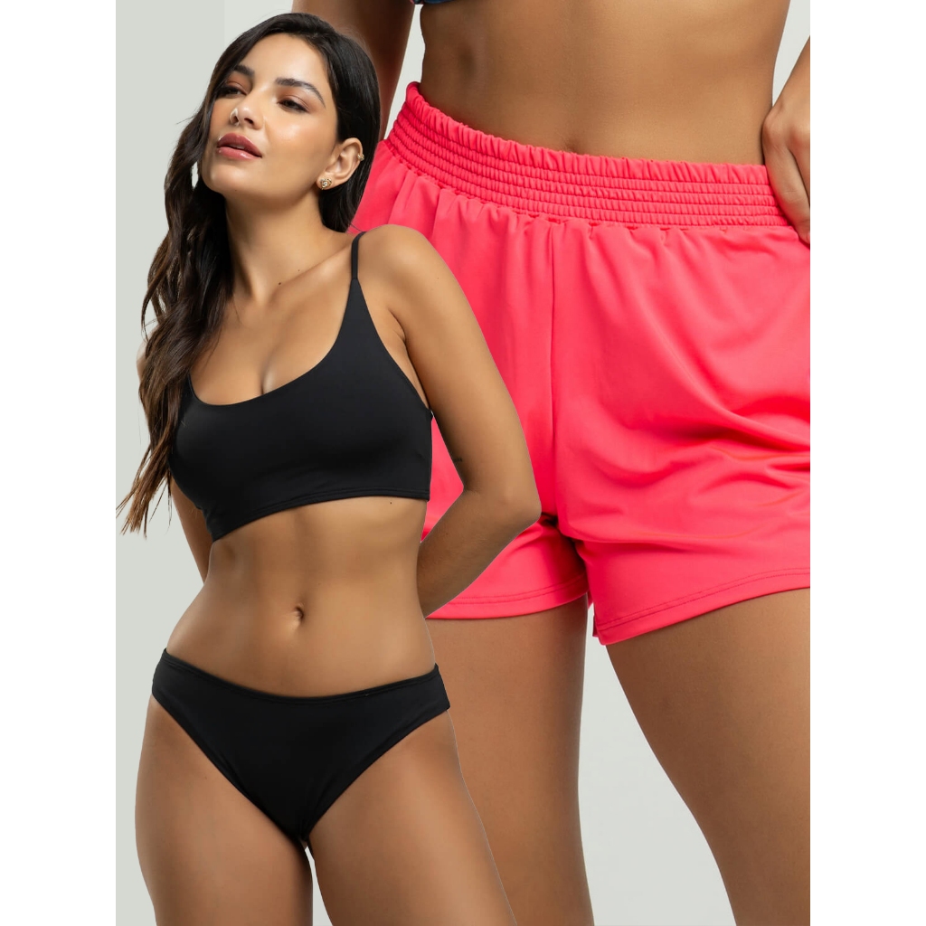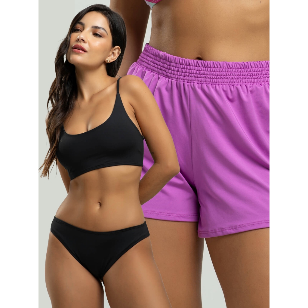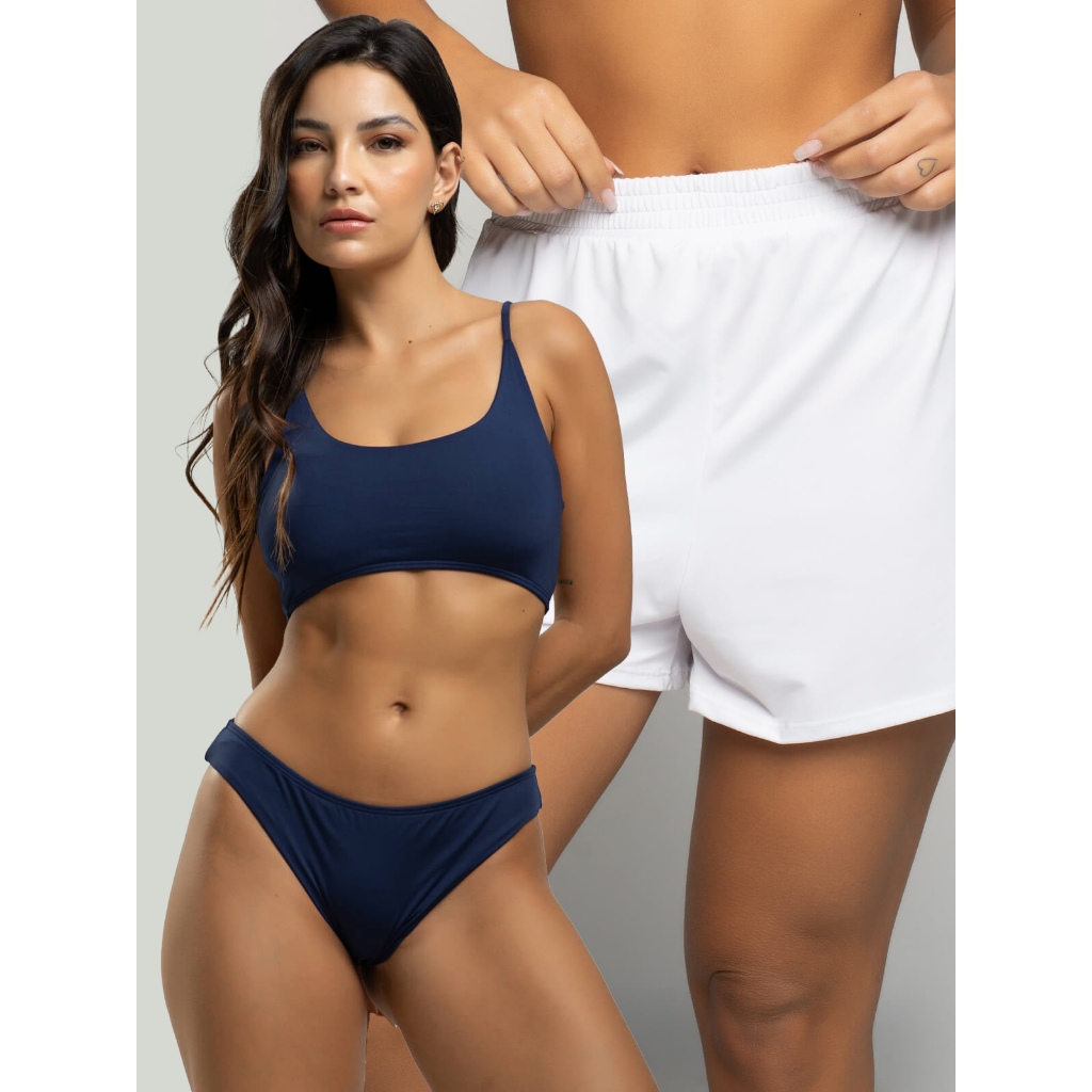 Biquíni Faixa Liso Calcinha Comum Bojo Removivel + Short Curto Liso Tecido Proteção Solar Uv 50+