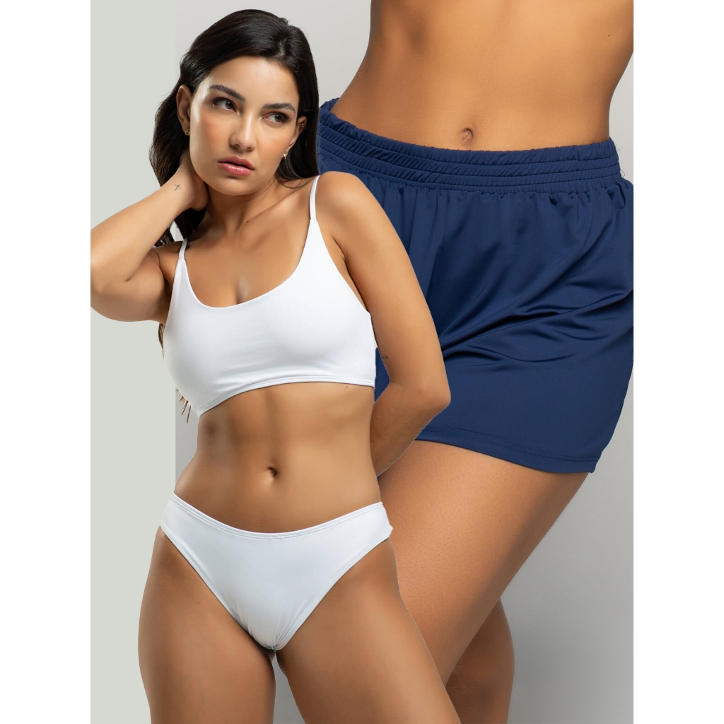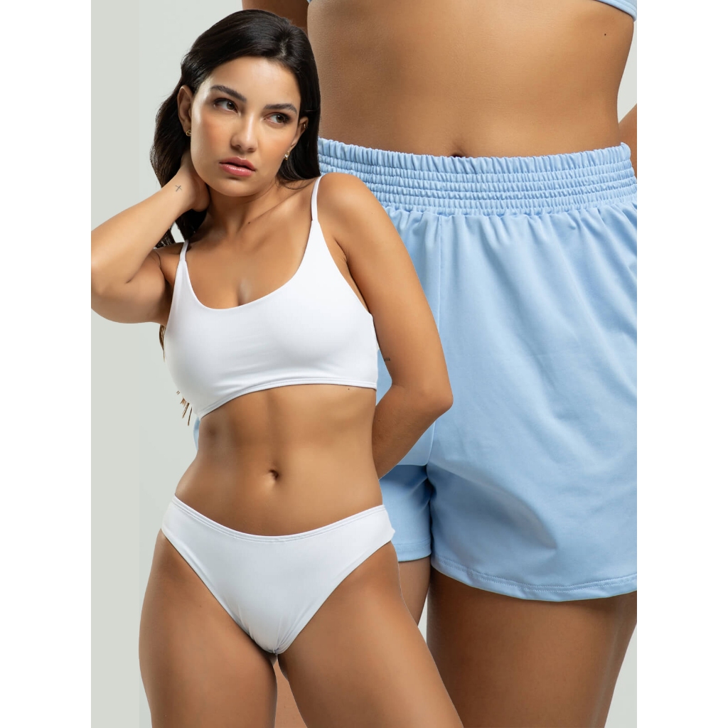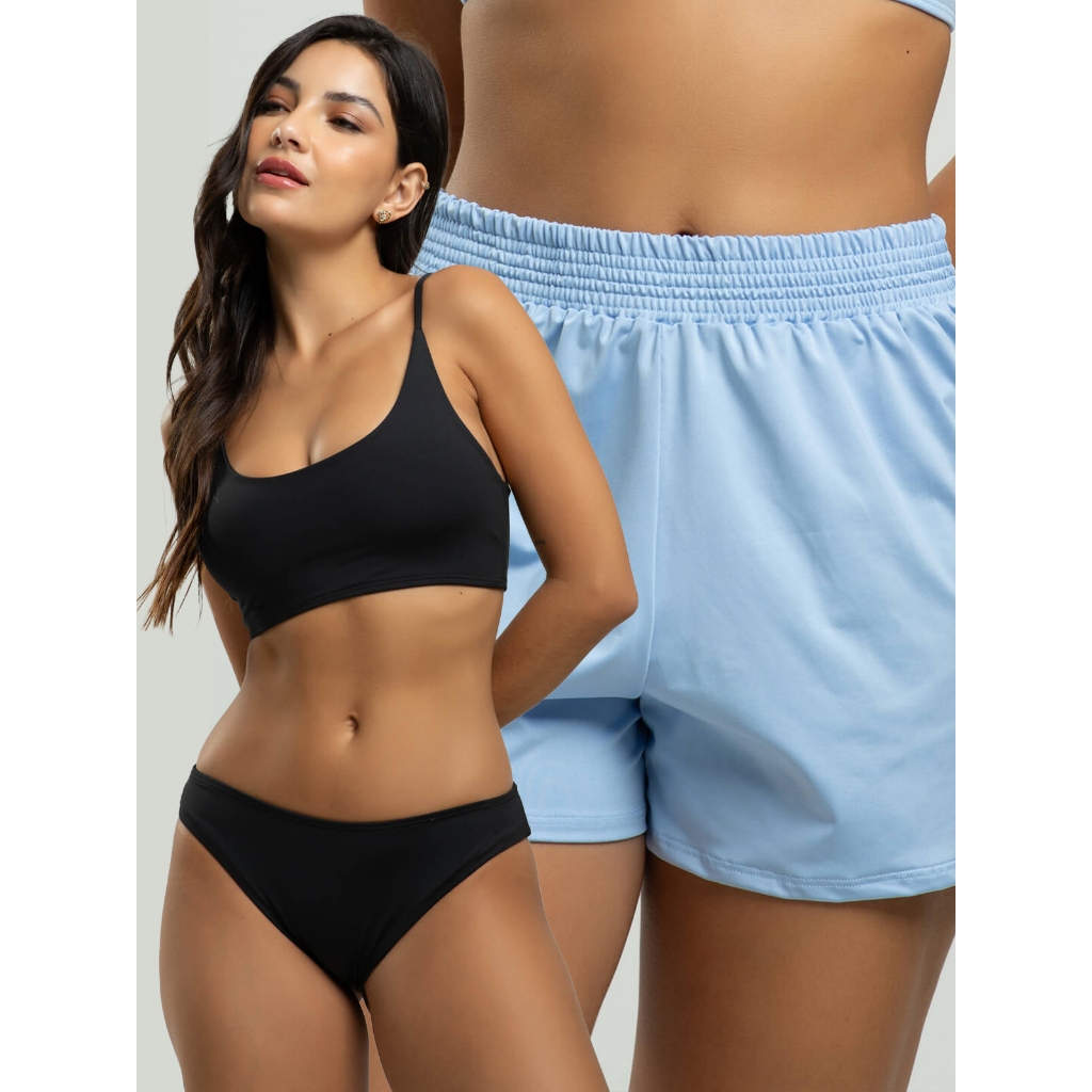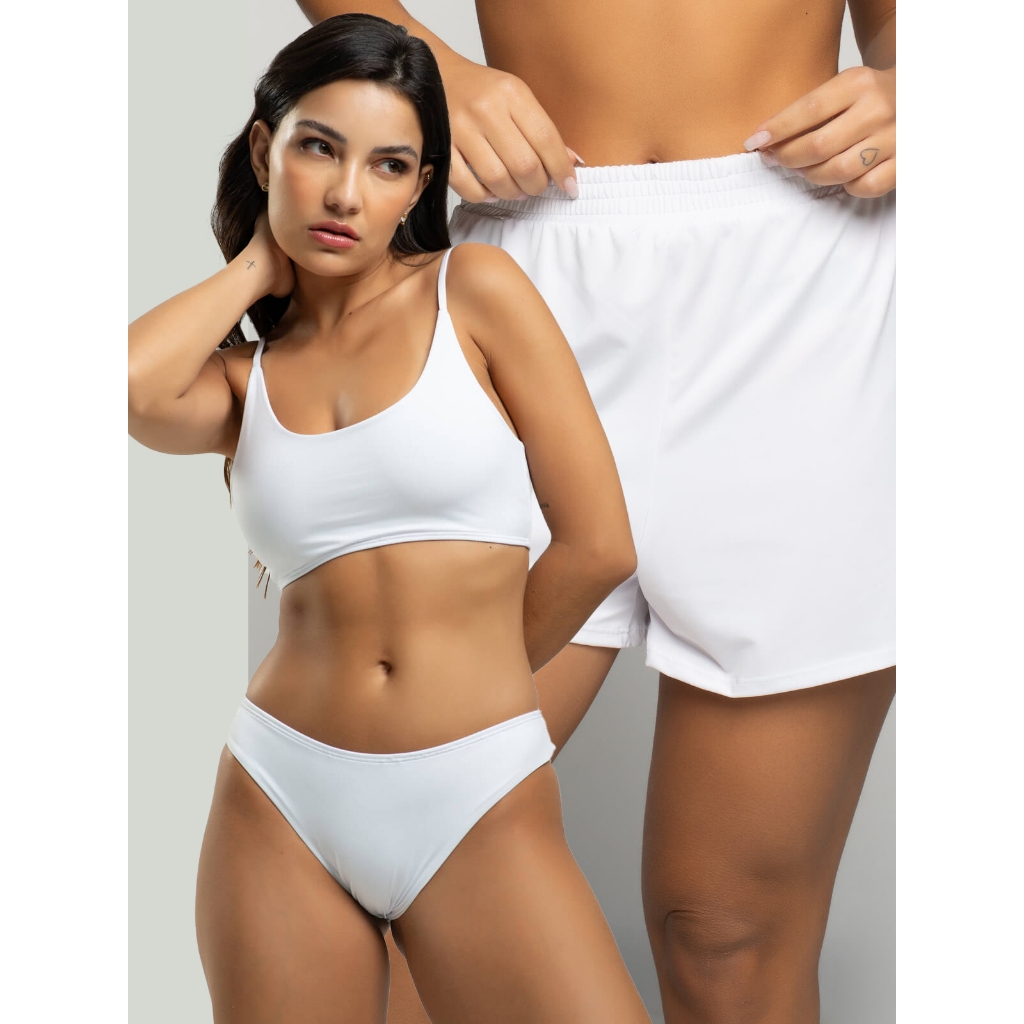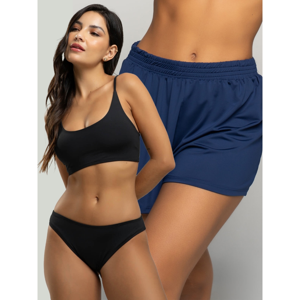 Biquíni Faixa Liso Calcinha Comum Bojo Removivel + Short Curto Liso Tecido Proteção Solar Uv 50+