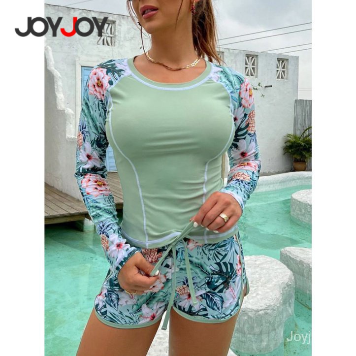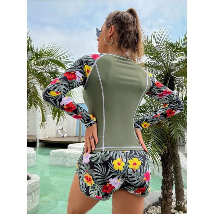 Biquíni Sexy de Duas Peças para Praia, Maiô de Manga Longa Feminino Estilo Conservador, Proteção Solar UV, Boxer Estampa