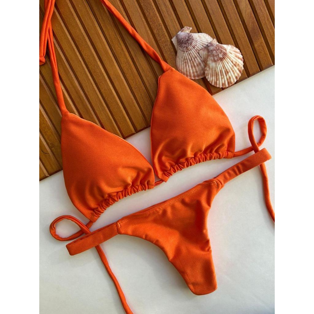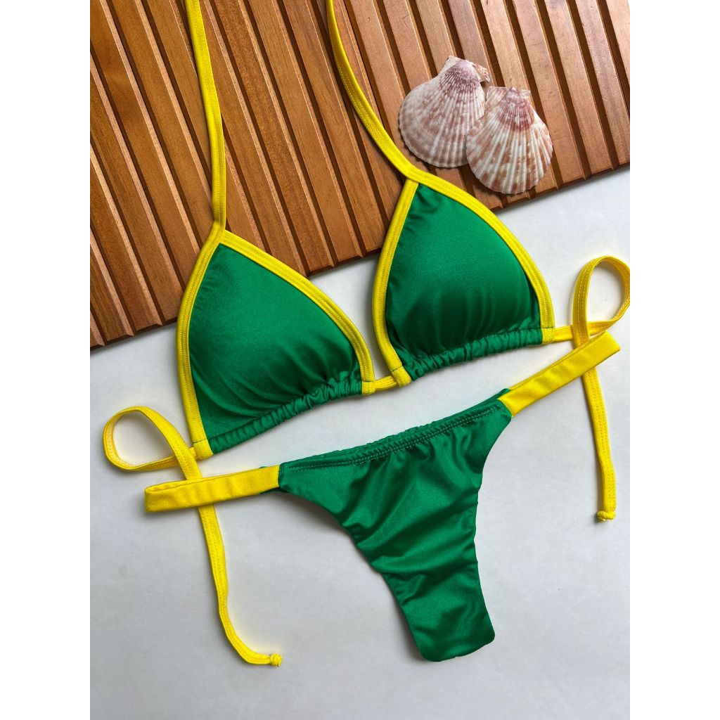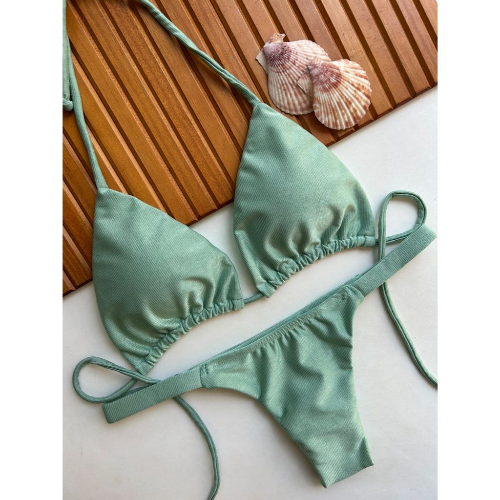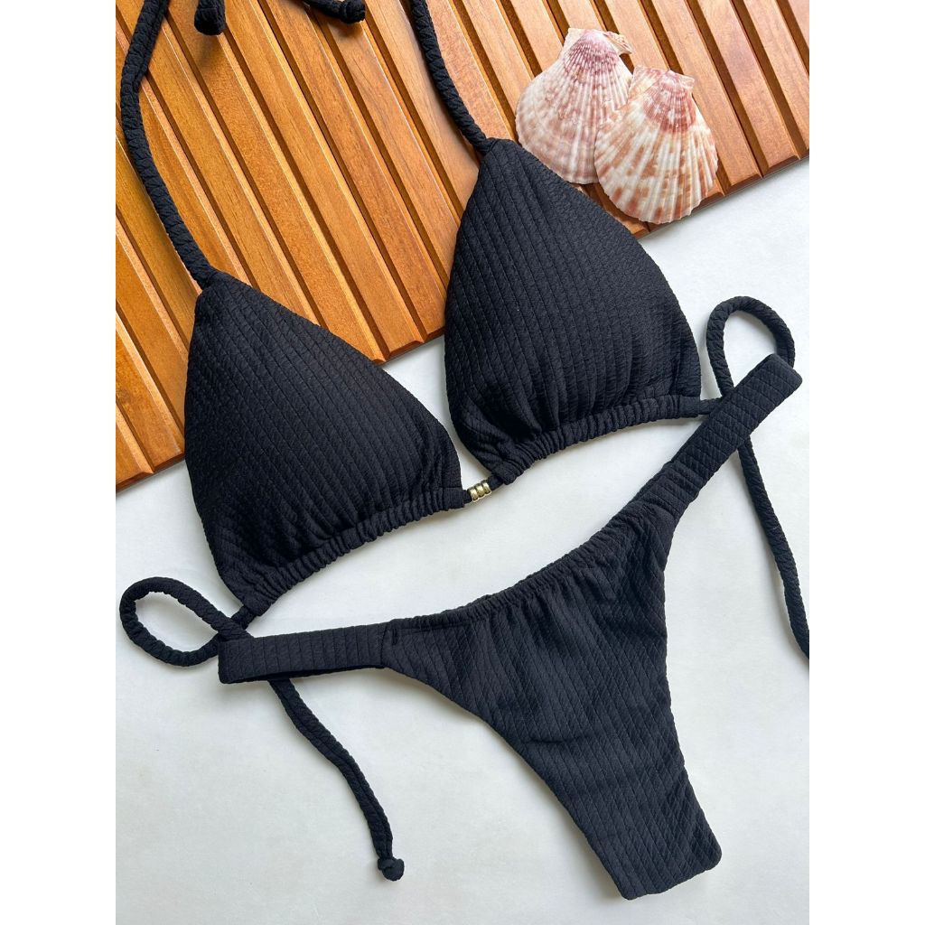 Biquíni cortininha com calcinha marquinha de fita fio duplo bronze
