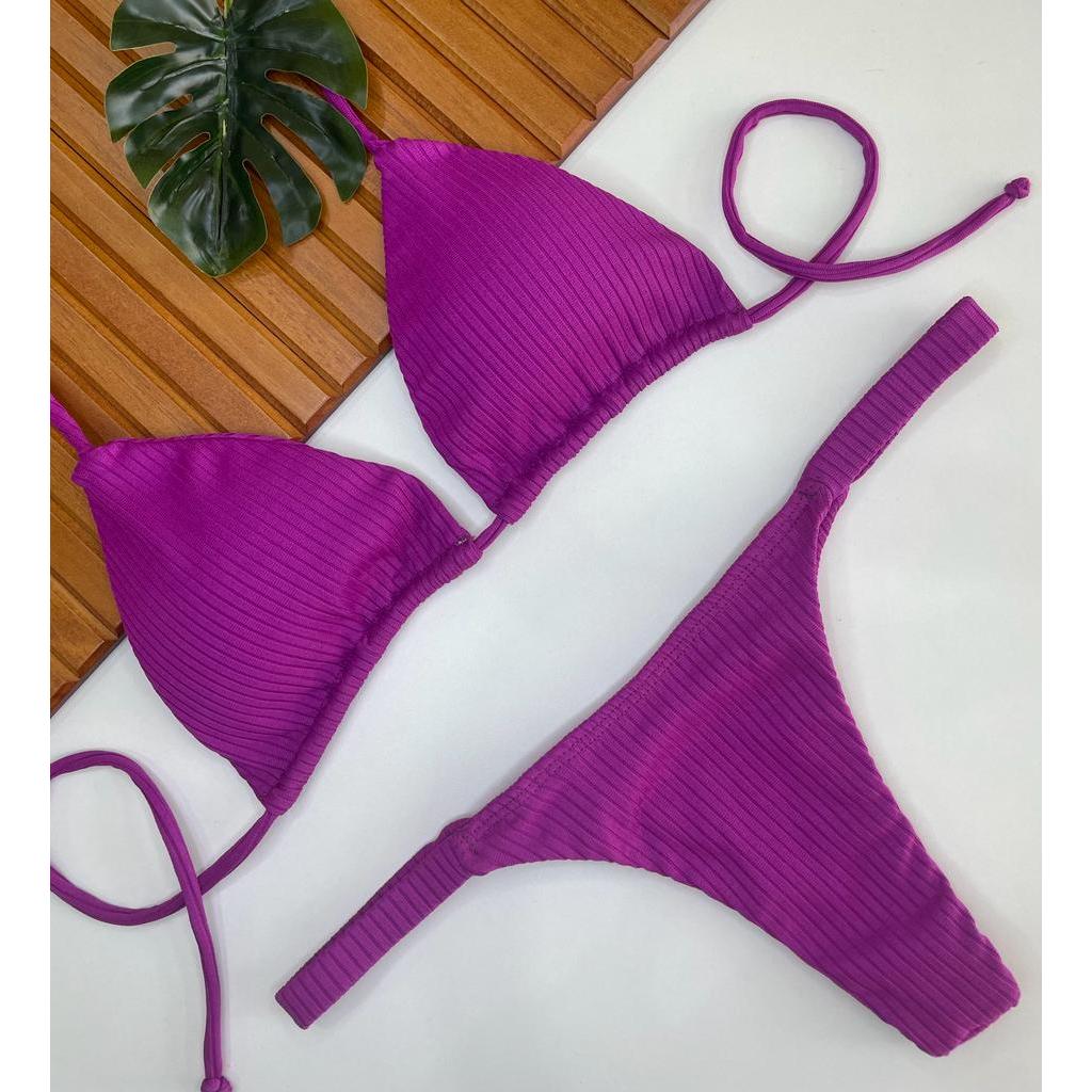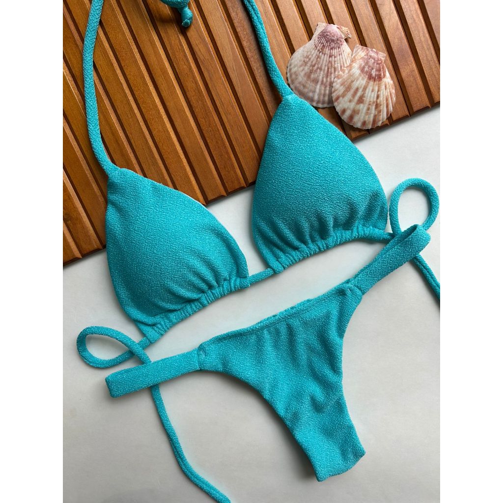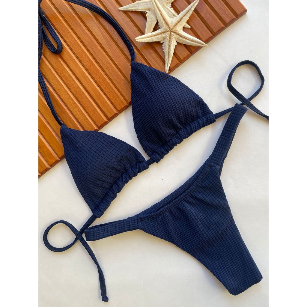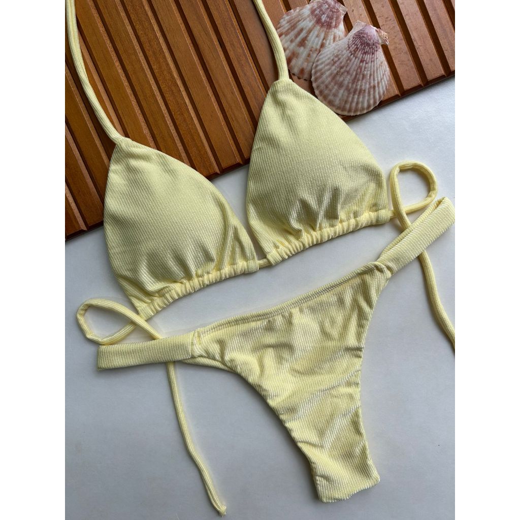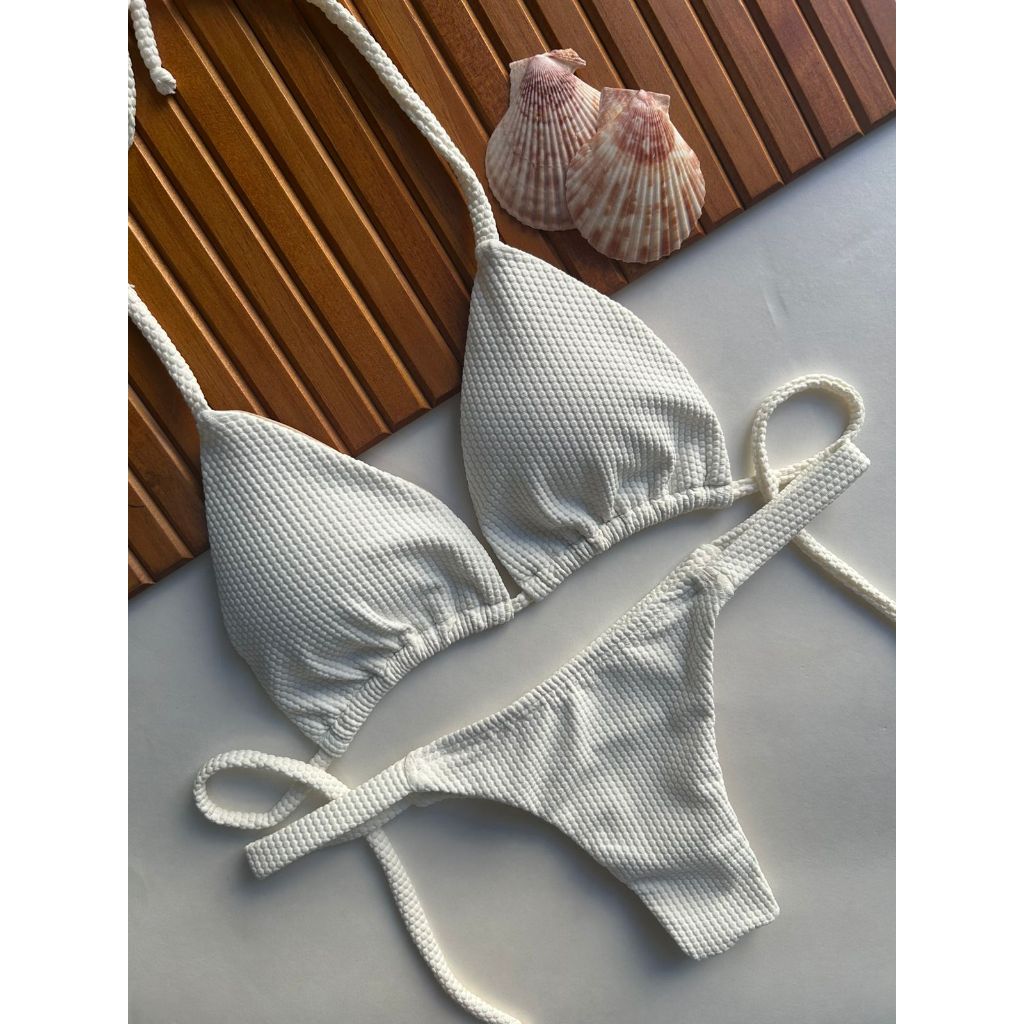 Biquíni cortininha com calcinha marquinha de fita fio duplo bronze