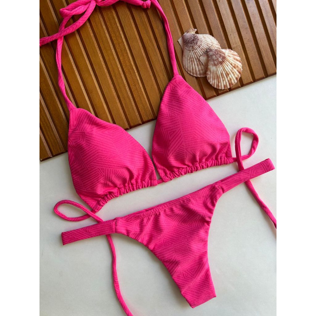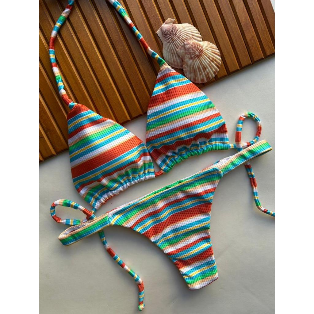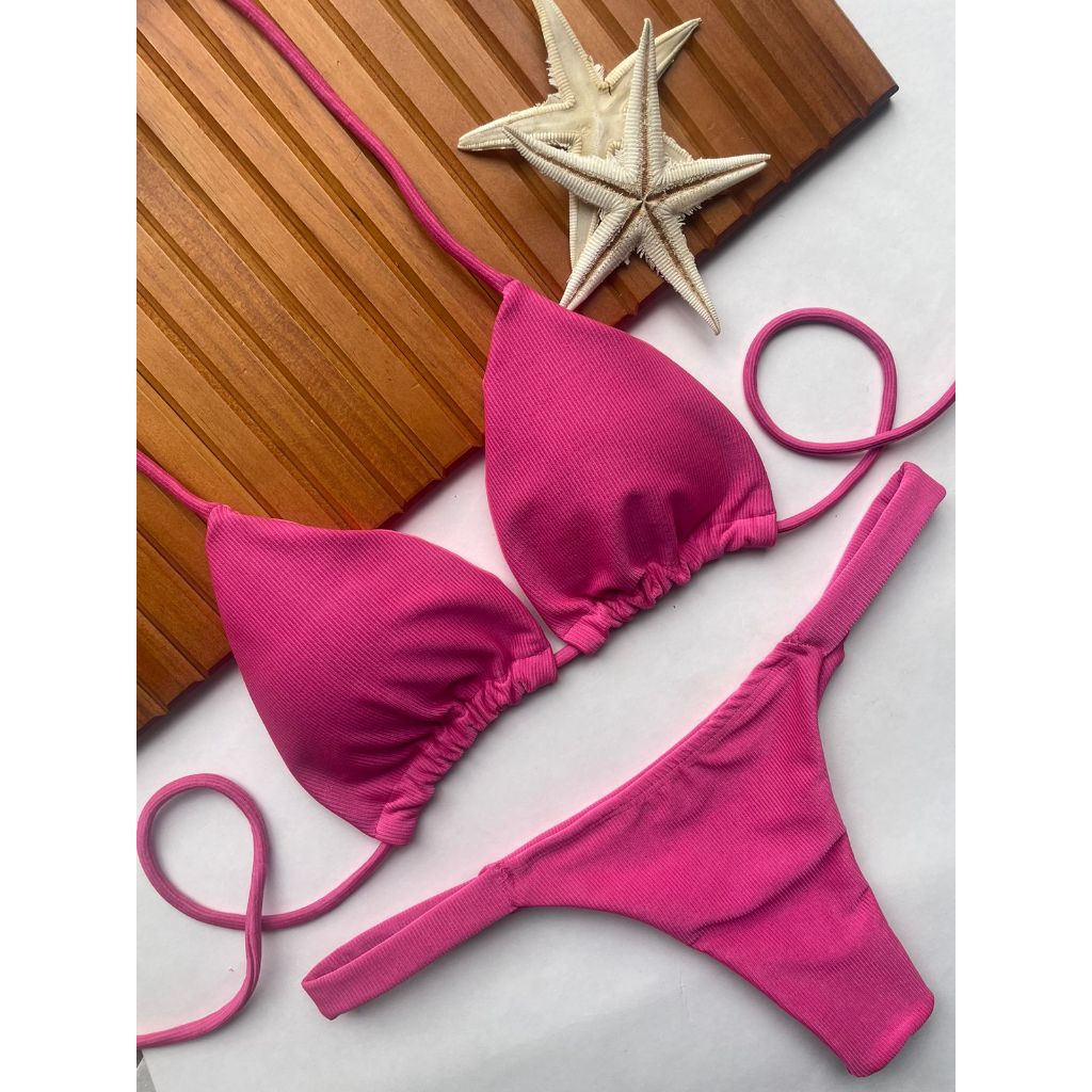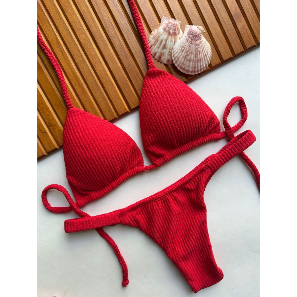 Biquíni cortininha com calcinha marquinha de fita fio duplo bronze
