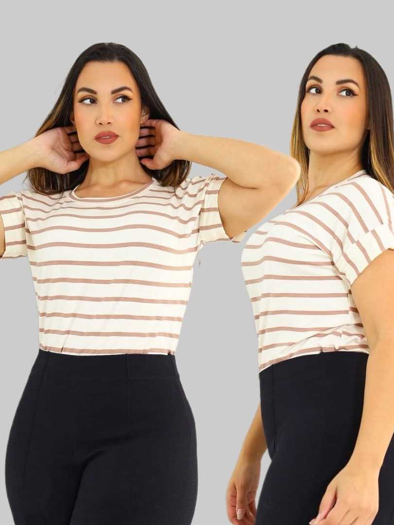 Blusa Femenina T-shirt Listrada, lisa Manga Curta Doblada Cores Verao Inverno Tendencia 2026 Viscolycra Premium