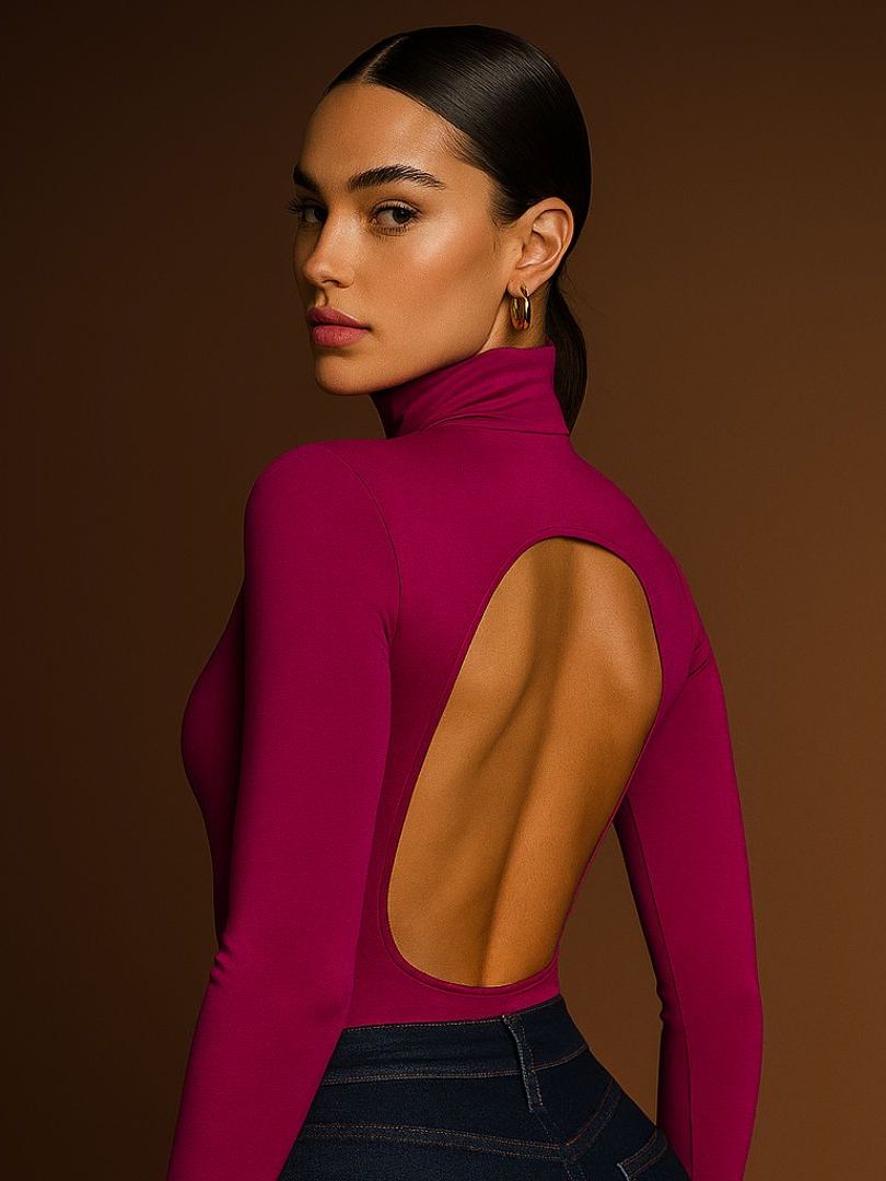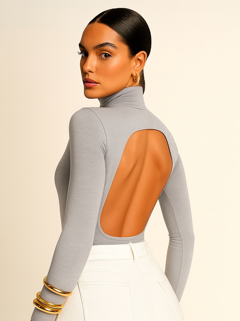 Body Feminino Paris Costas Nua Aberta Manga longa Comprida Gola Alta Estilosa Elegante Gringa