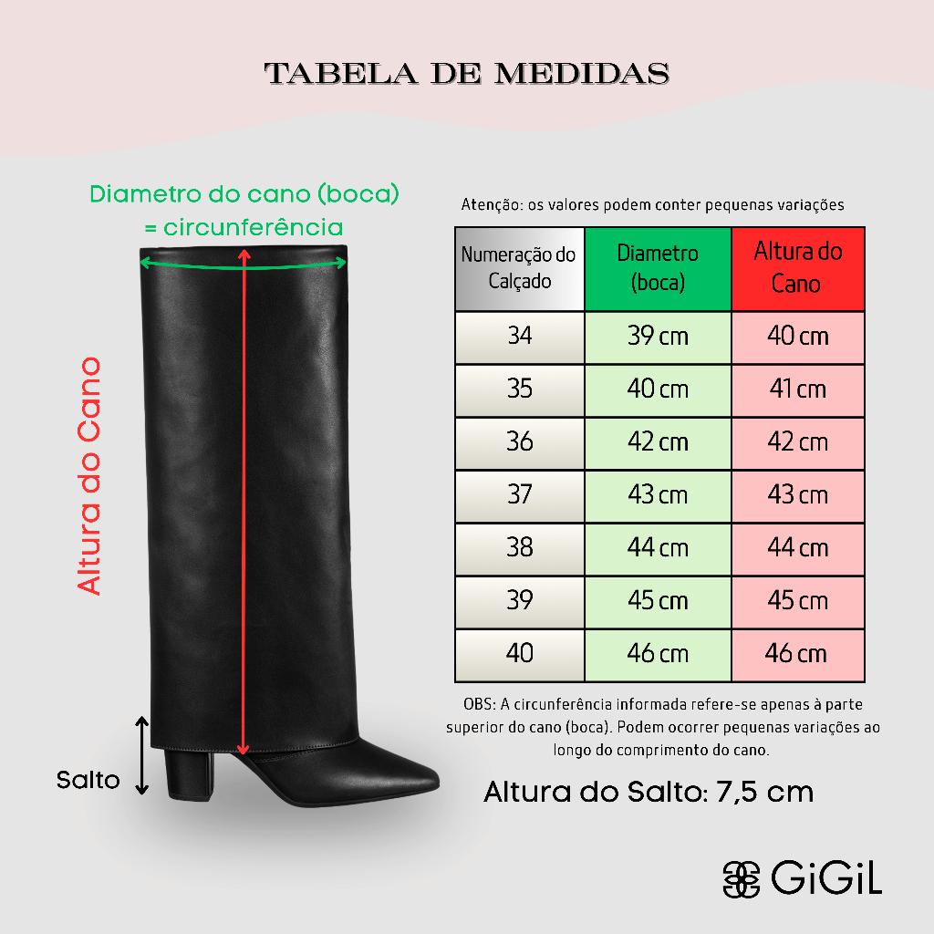 Bota Capa Feminina Cano Longo Salto Alto Bloco Bico Fino Elegante Moda Capry GiGiL