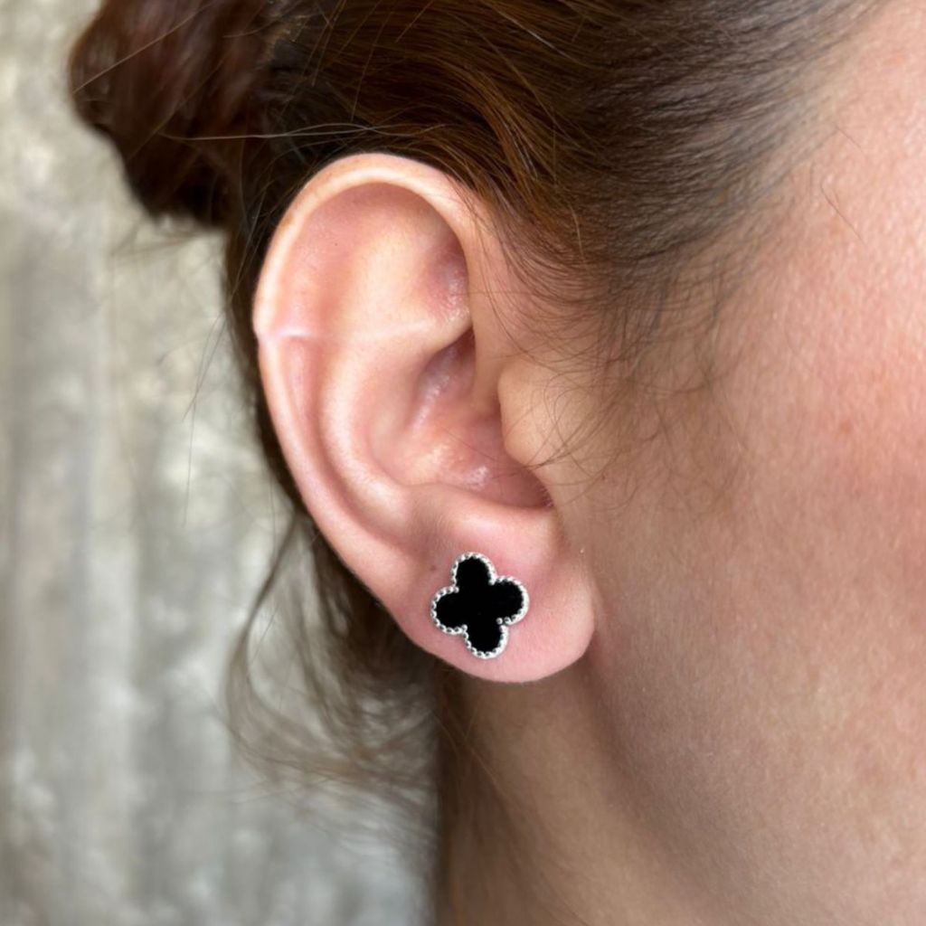 Brinco Feminino de Prata 925 Trevo Onix com 1,2cm