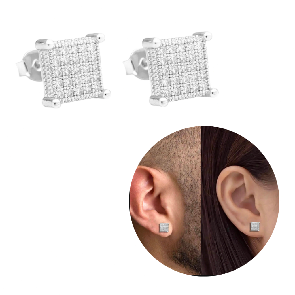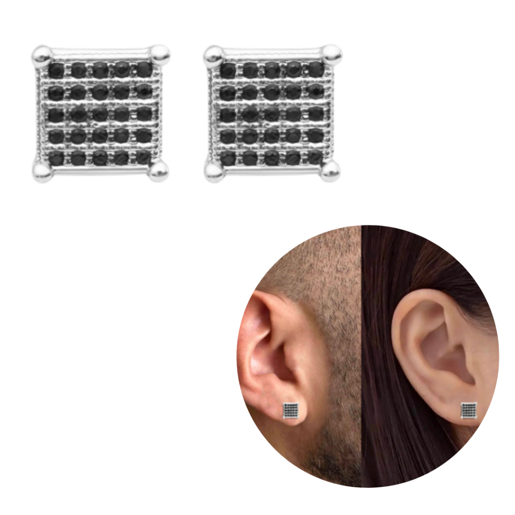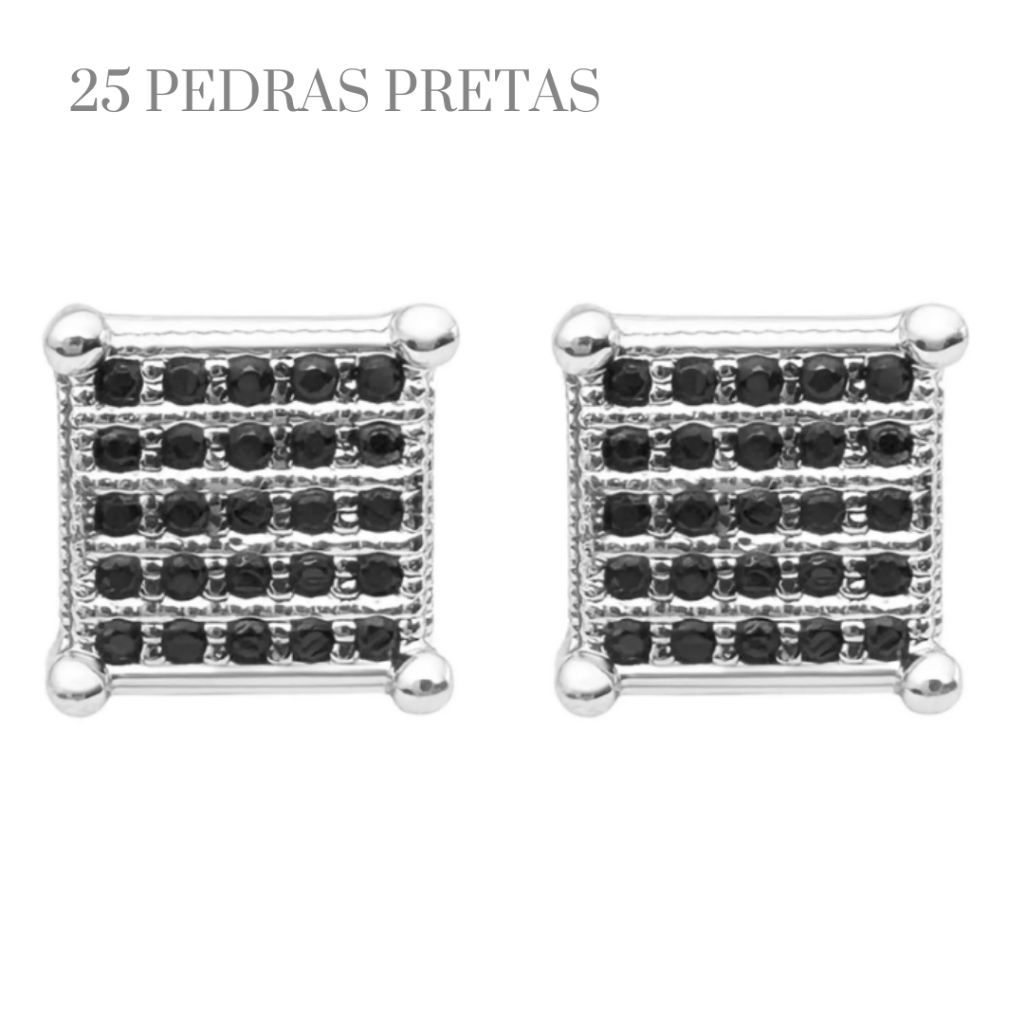 Brinco Masculino De Prata 925 Quadrado C/ Pedras Brilhantes Banhado a Prata 925 Brinco Cravejado