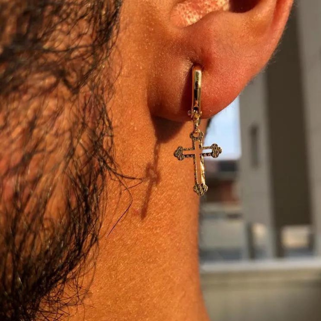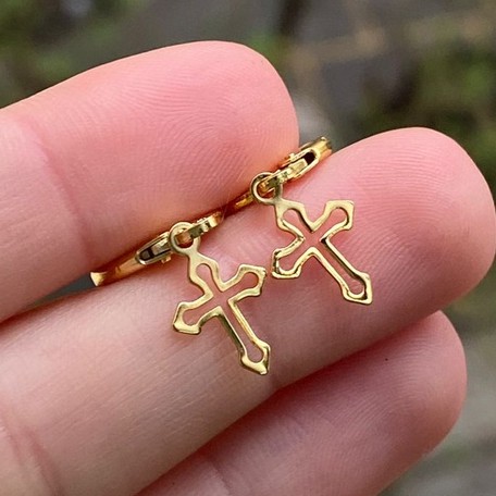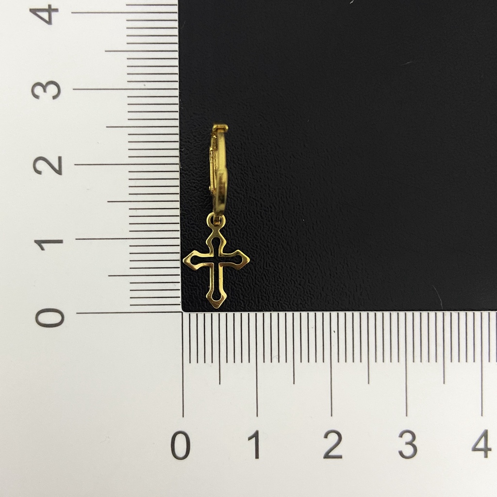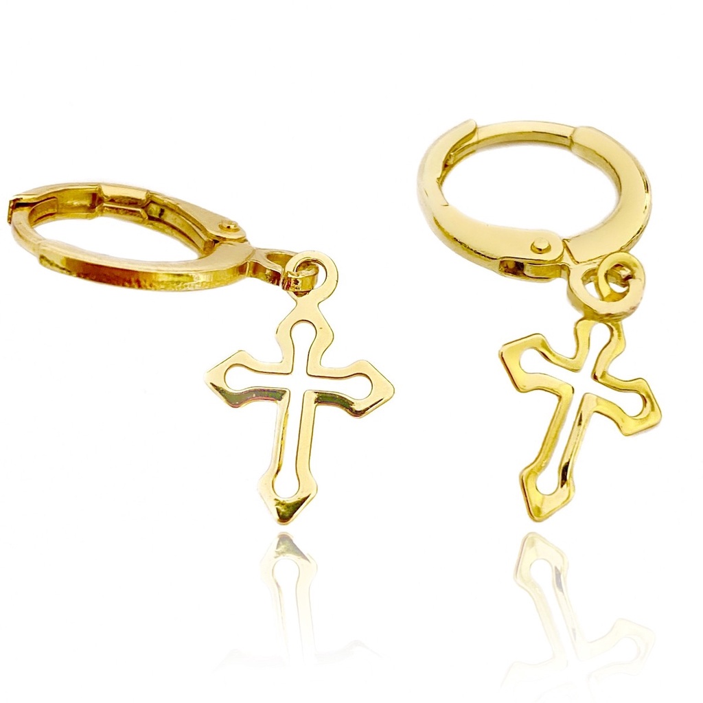 Brinco de Argola com Cruz de Ouro 24k Crucifixo Vazado Masculino Banhado