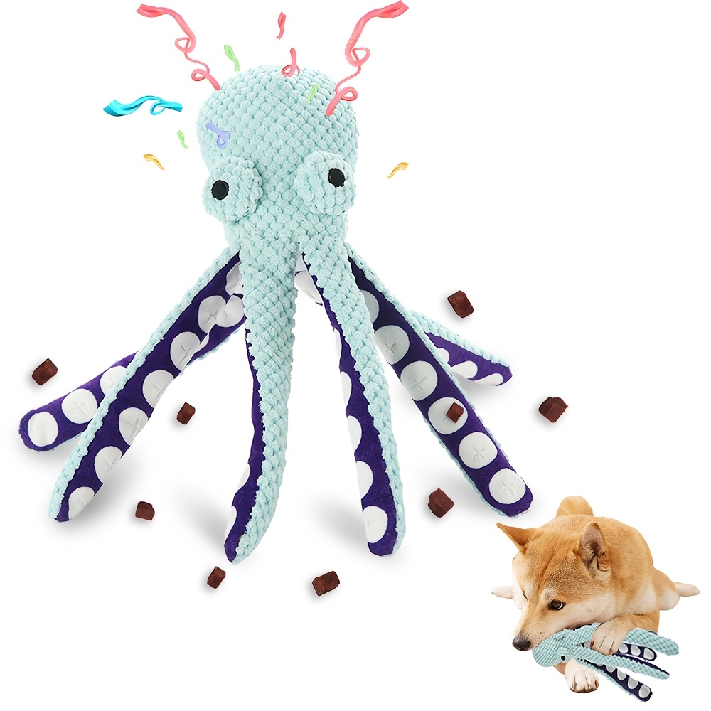 Brinquedo interativo de polvo de pelúcia para cães, durável e barulhento, ideal para pequenos e médios, azul e roxo.