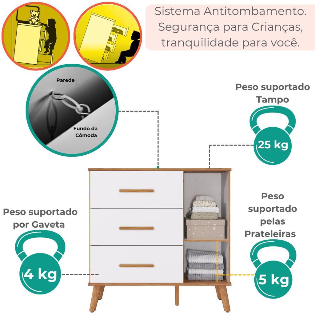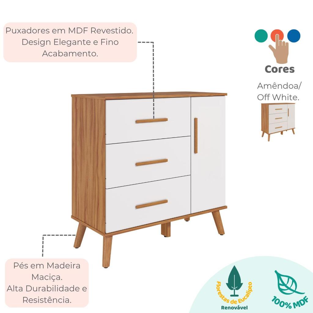Cômoda Bebê Infantil 3 Gavetas 1Porta 100% MDF Pé Palito