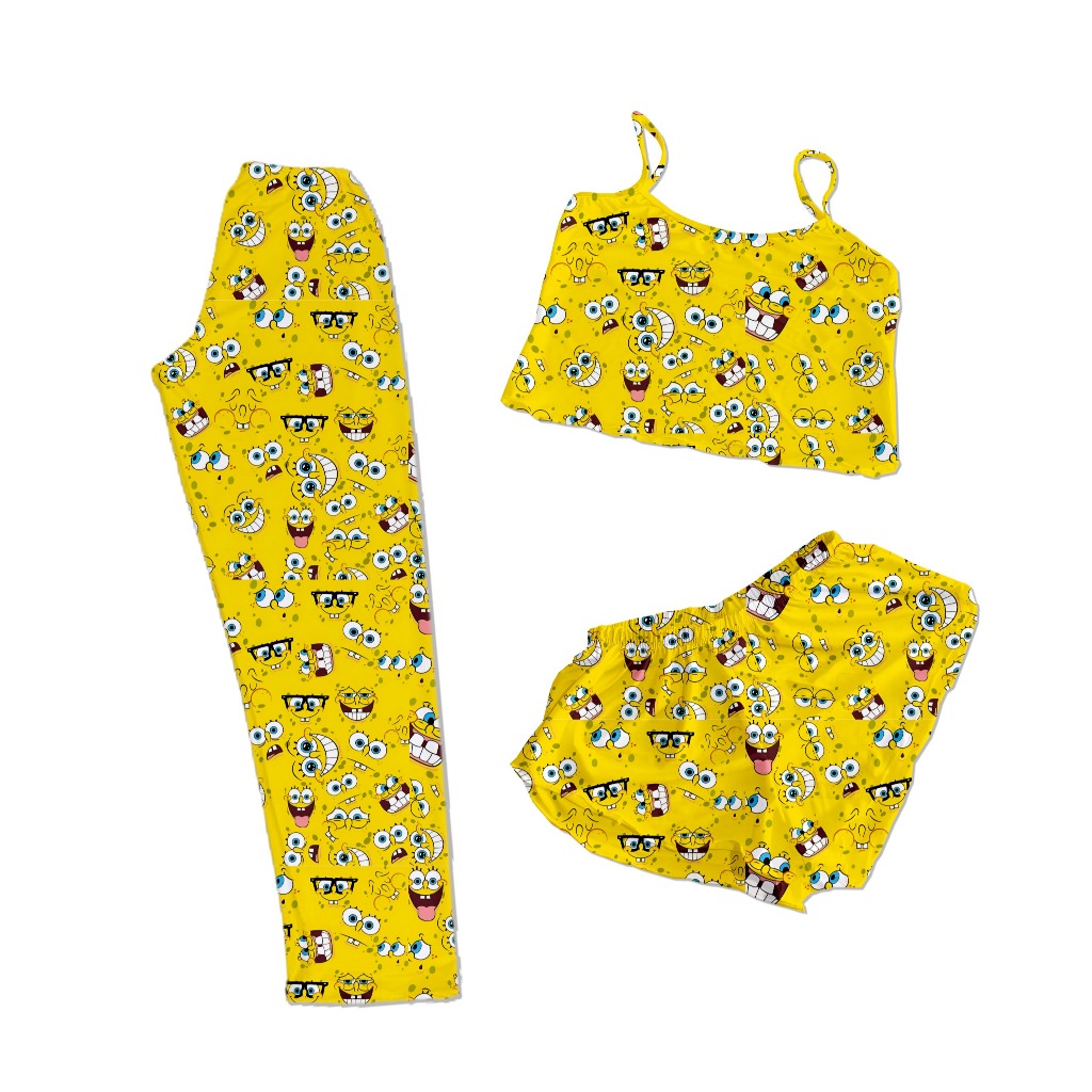 CONJUNTO PIJAMA 3 PEÇAS CALÇA SHORTS E CROPPED PERSONAGENS AMARELO