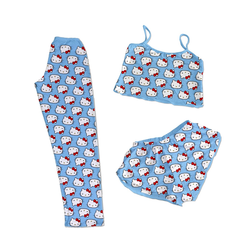 CONJUNTO PIJAMA 3 PEÇAS CALÇA SHORTS E CROPPED PERSONAGENS AZUL