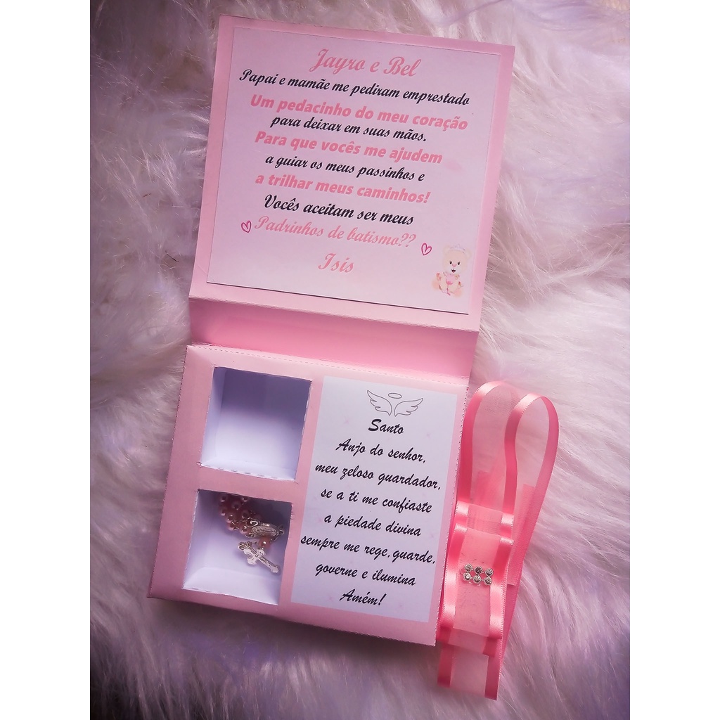 CONVITE PADRINHOS DE BATISMO E CASAMENTO CAIXINHA COM ALMOFADINHA E TERÇO, caixa personalizada