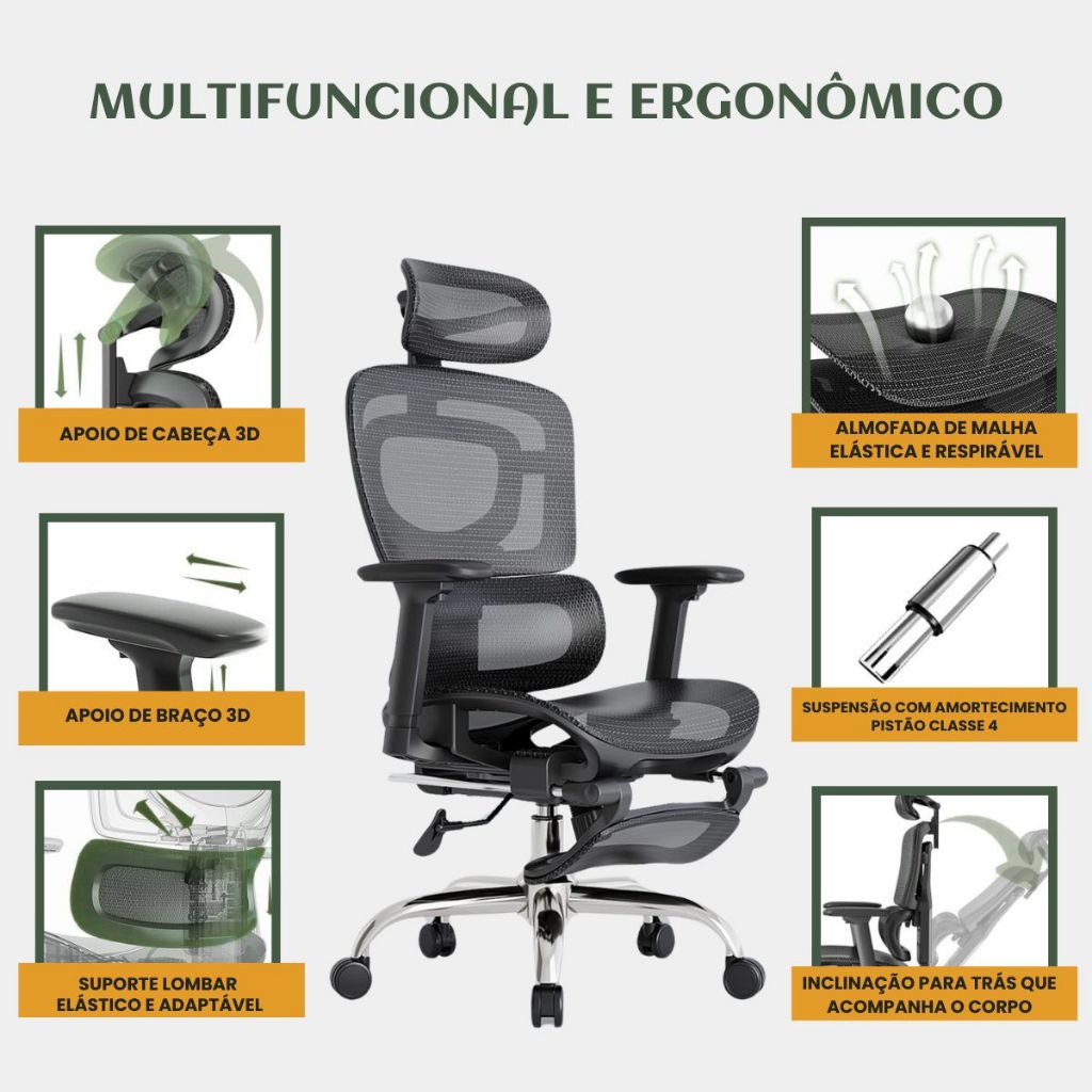 Cadeira Escritório Ergonômica Mônaco BT07/WT07 Luvinco Malha Respirável Lombar Adaptável Apoio Pés