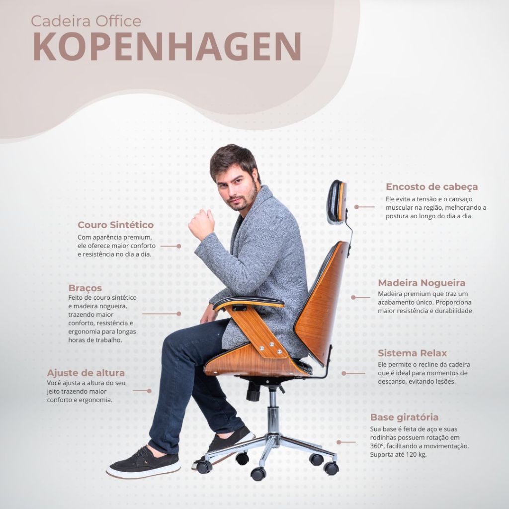 Cadeira de Escritório Ergonômica Giratória Fratini Kopenhagen Presidente Apoio Cabeça Office Preta