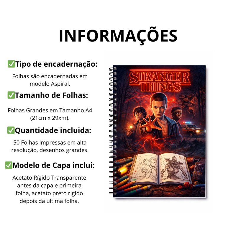 Caderno Stranger Things Desenhos Para Colorir A4 50 Folhas Espiral Série Suspense Fantasia Livro de Arte Ilustração