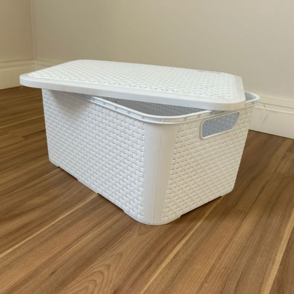 Caixa Cesta Organizadora Rattan 18 Litros Branco com Tampa e Alças Reforçadas