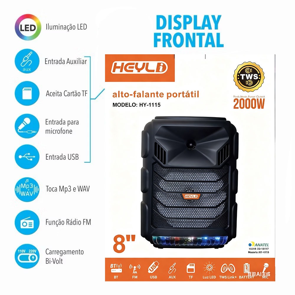 Caixa De Som Bluetooth 2000W Portátil com Microfone Fm Led Rgb