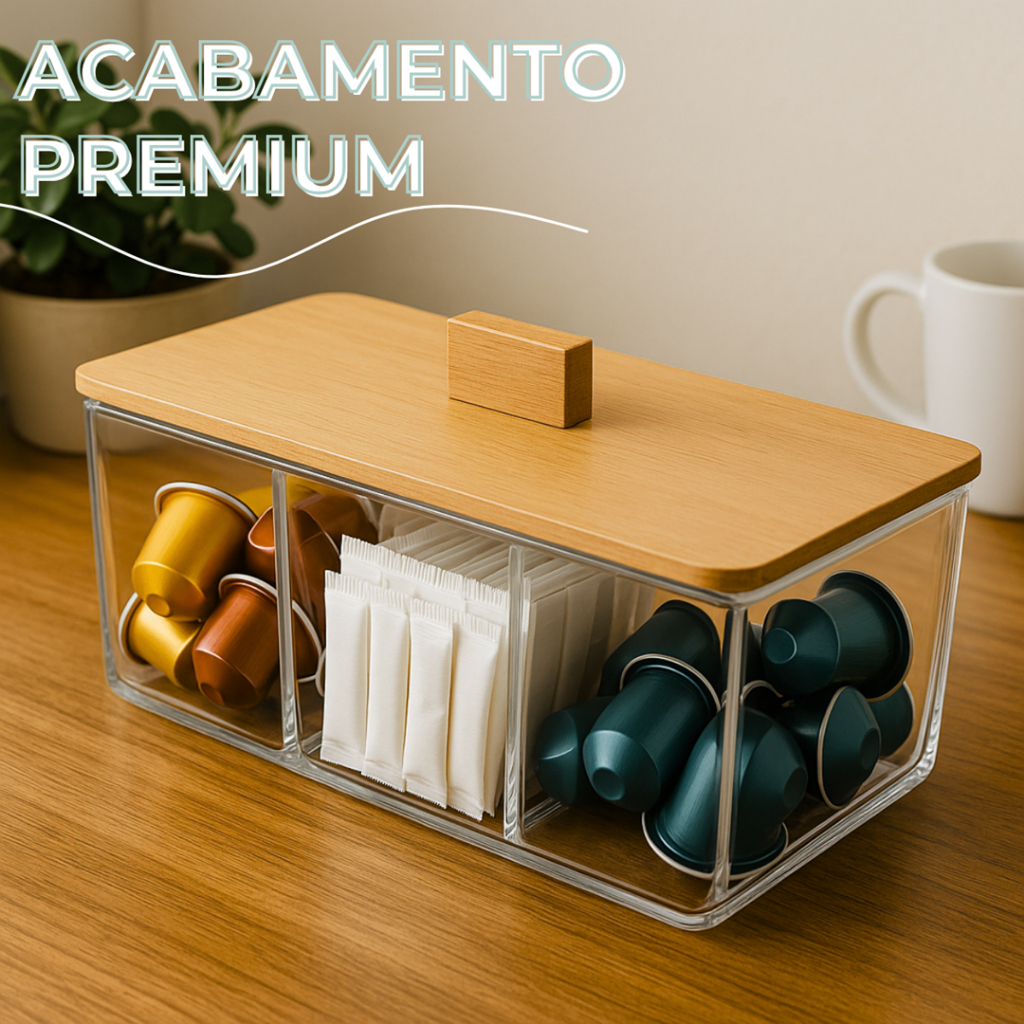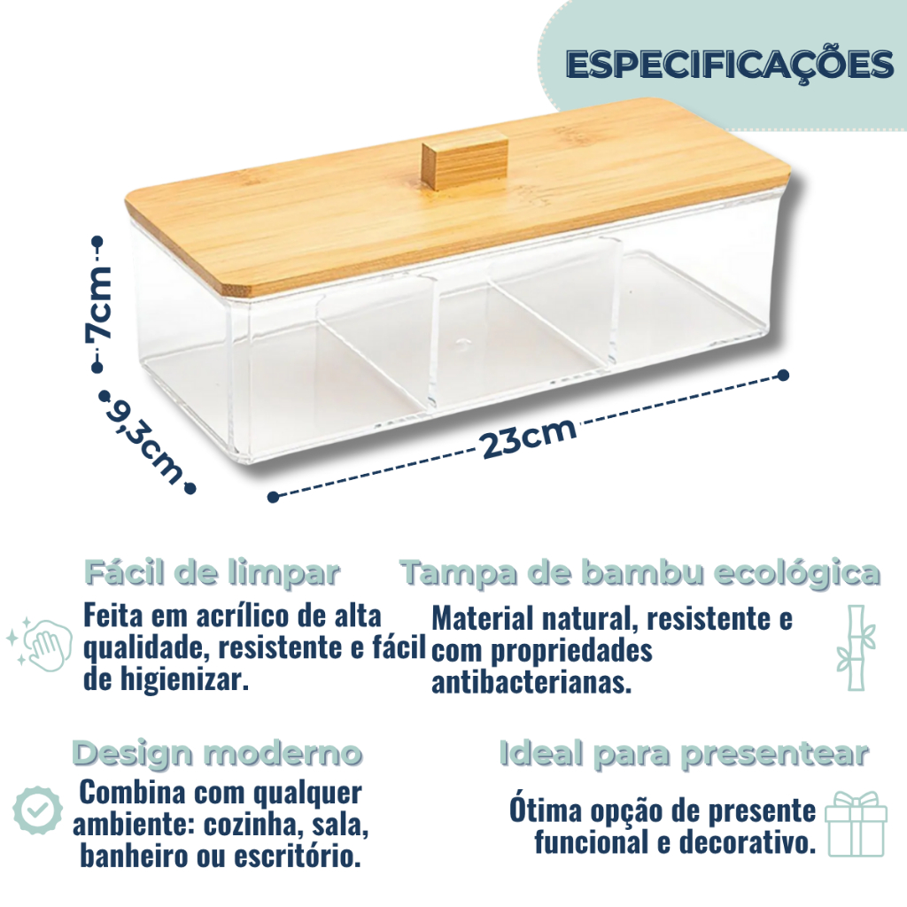Caixa Organizadora Acrílica Porta Saches De Chá Porta Joia Com 3 Divisórias E Tampa De Bambu